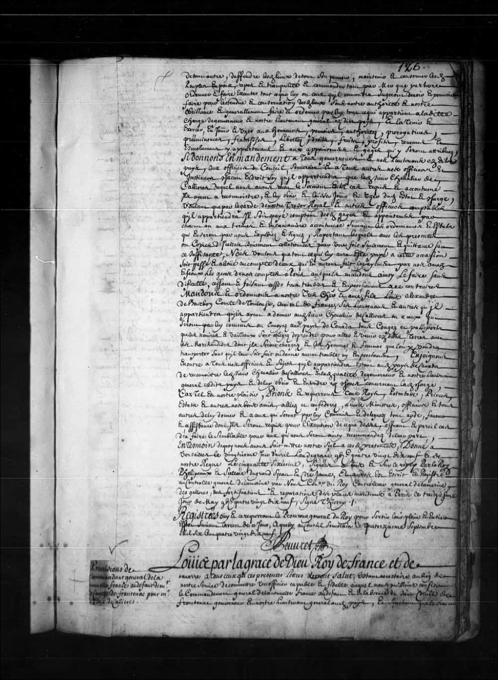 Lettres de provisions par le Roi de commandant général de la Nouvelle-France au défaut et en l'absence du sieur Louis de Buade, Comte de Frontenac, gouverneur et lieutenant général audit pays, pour Louis-Hector de Callières, Chevalier, gouverneur de Montréal, 4 juin 1699, Archives nationales à Québec, Fonds Conseil souverain, (03Q,TP1,S36,P372).