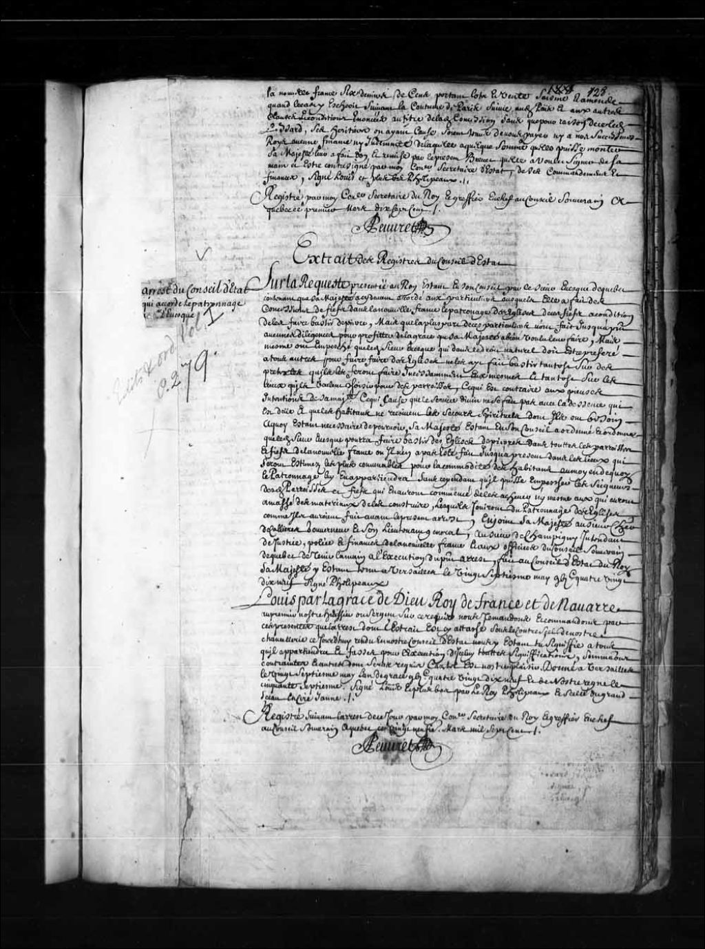 Brevet de confirmation par le Roi de l'arrêt de Son Conseil d'État accordant le patronage des églises de la Nouvelle-France à l'évêque de Québec