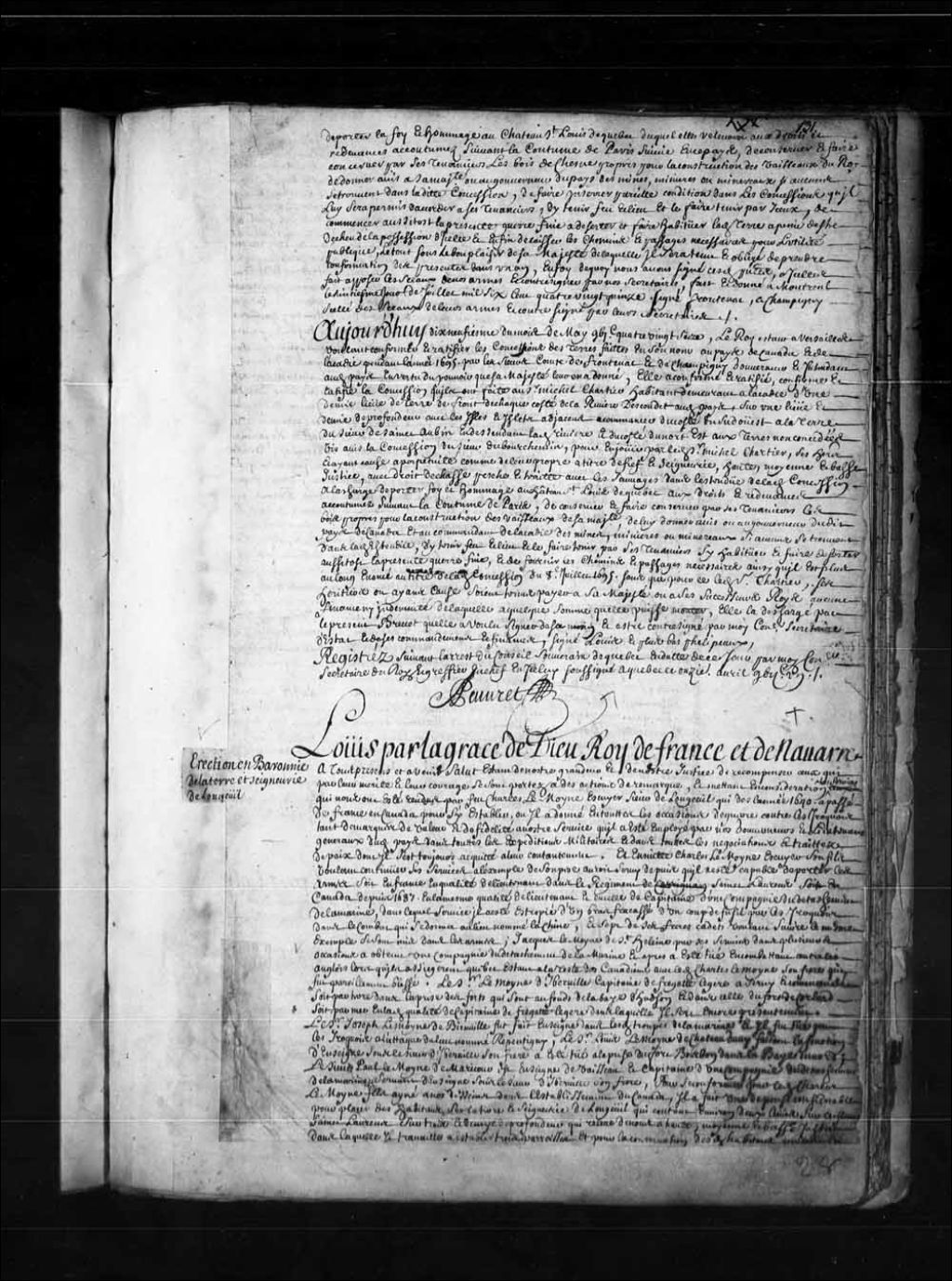 Lettres d'érection en baronnie par le Roi de la terre et seigneurie de Longueuil en faveur de Charles LeMoyne de Longueuil (LeMoine), 26 janvier 1700, Archives nationales à Québec, Fonds Conseil souverain, (03Q,TP1,S36,P391).