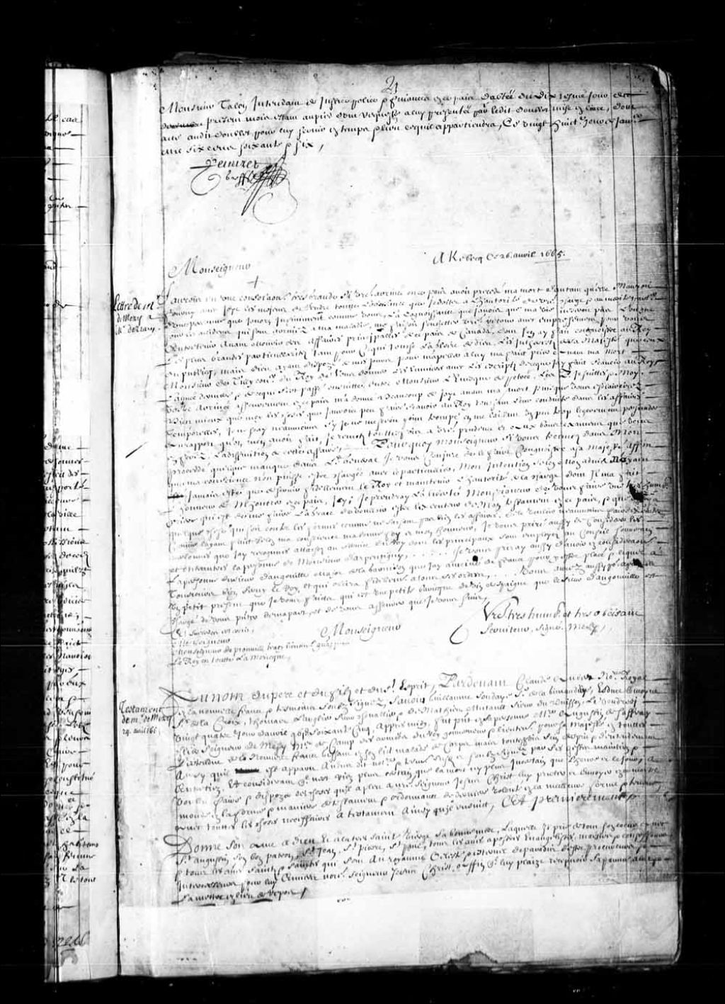 Lettre du sieur Augustin de Saffray de Mézy (Mésy), gouverneur de la Nouvelle-France, à Monseigneur Alexandre de Prouville Tracy, lieutenant général pour le Roi en toute l'Amérique