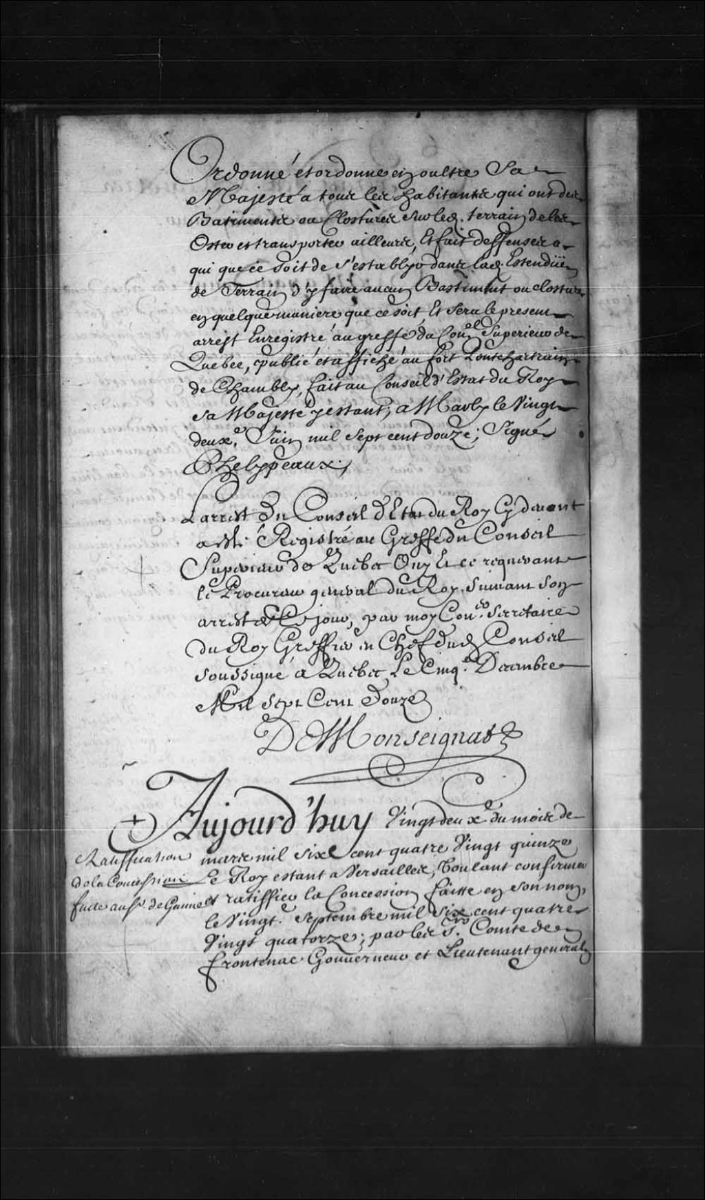 Brevet de confirmation par le Roi en faveur de Louis de Gannes, écuyer, sieur de Falaise, lieutenant d'une compagnie des troupes du détachement de la Marine, de la concession lui ayant été faite le 20 septembre 1694 par Louis de Buade, Comte de Frontenac, et Jean Bochart Champigny, gouverneur et intendant de la Nouvelle-France, de deux lieues de terre de profondeur derrière la terre et seigneurie de Contrecoeur sur toute sa largeur qui est de deux lieues, laquelle profondeur passera en partie au-delà de la rivière de Chambly (Richelieu), avec les îles et îlets se trouvant dans ladite rivière de Chambly