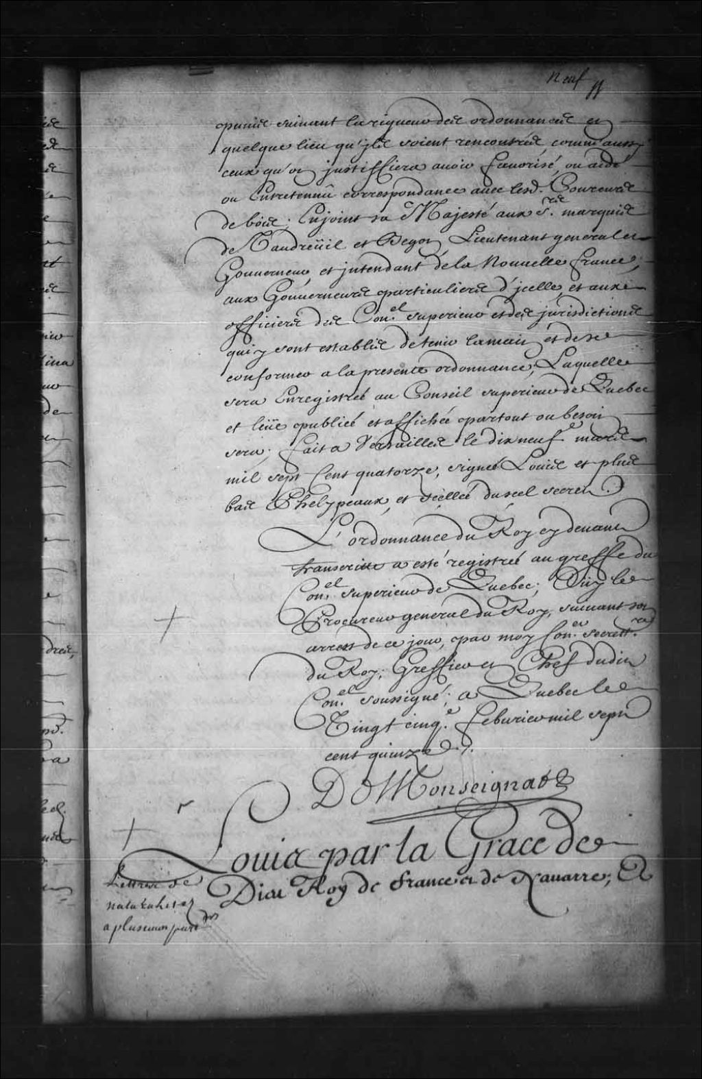 Lettres de naturalité accordées par Sa Majesté à Jean Otis, Jean Arnald (Arnauld, Arnold, Arnal, Harnal), Jean Wilet (Willet, Houlet), Édouard Fléchier (Fletcher, Flécheur), Édouard Clements (Clément), Guillaume White, Jacques Pillobury, Richard Taylor (Taillard), Thomas Jeffereys (Jeffreys, Jeffrey, Geoffroy), Thomas Stillet (Stilet, Tilet), Jean Scothoin (Scofen, Scotin), Richard Pearse (Pears), Christophe Wood, Jacques Horey (Horay, Lorey, Loray), Charles Stevard (Steward, Stewart, Stuart), Charles Taylor, Jacques Leiyten (Leigten), Isaac Ruff (Ruft), Charles Davis (Devis, Deviss), Guillaume Wilding, Robert Dison (Dickson, Dixon), Jean Devis, Thomas Shouldun (Shouldom), Jean Banistoc, Charles Menning (Menin), Marie Hocman), veuve de Howe (Whove), Marie-Anne Dren (Drew), Joseph Greenhill, Guillaume Perrins (Perrin), Thomas Buraft, Jean Reed, Joseph Robert, Daniel Maddox, Jeanne Wardaway, Anglais et Anglaises natifs de la vieille Angleterre, Daniel Fisk, Simon Lucas, Victor-Thomas Dian, Catherine Parsons, natifs de la Nouvelle-Angleterre, Jean Holond et Denis Bryere, natifs d'Irlande, tous quarante habitants de la Nouvelle-France et faisant profession de la religion catholique, apostolique et romaine, 1er juin 1713 - 31 juin 1713, Archives nationales à Québec, Fonds Conseil souverain, (03Q,TP1,S36,P500).