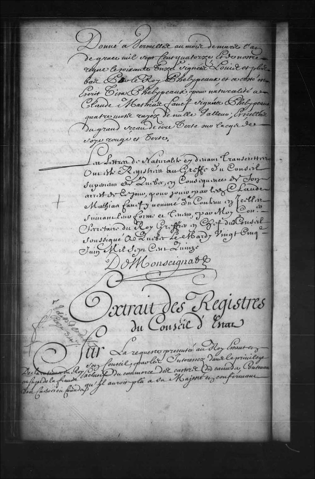 Déclaration du Roi au sujet de la fraude des castors en Canada, 6 mai 1715, Archives nationales à Québec, Fonds Conseil souverain, (03Q,TP1,S36,P502).