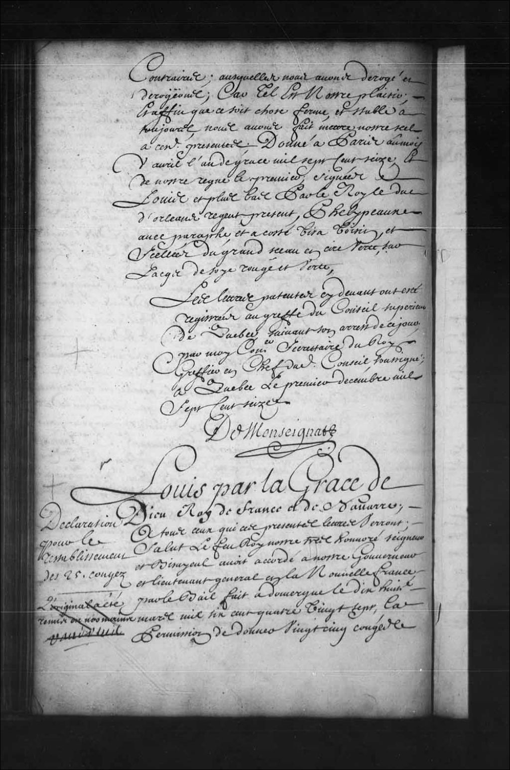 Déclaration de Sa Majesté pour le rétablissement des vingt-cinq congés de traite que le gouverneur et lieutenant général de la Nouvelle-France avait autrefois le pouvoir de donner chaque année pour aller en traite chez les nations sauvages (amérindiennes), lesquels congés étaient distribués par ce gouverneur aux pauvres familles de la colonie de Canada, laquelle pratique avait été supprimée le 21 mai 1696 vu l'abandon de la culture des terres, l'abondance du castor qui était causée tant par les Français qui montaient en vertu de ces permissions que sous d'autres prétextes et les débauches outrées de ces mêmes Français qui en ce temps se répandaient indifféremment chez toutes les nations sauvages