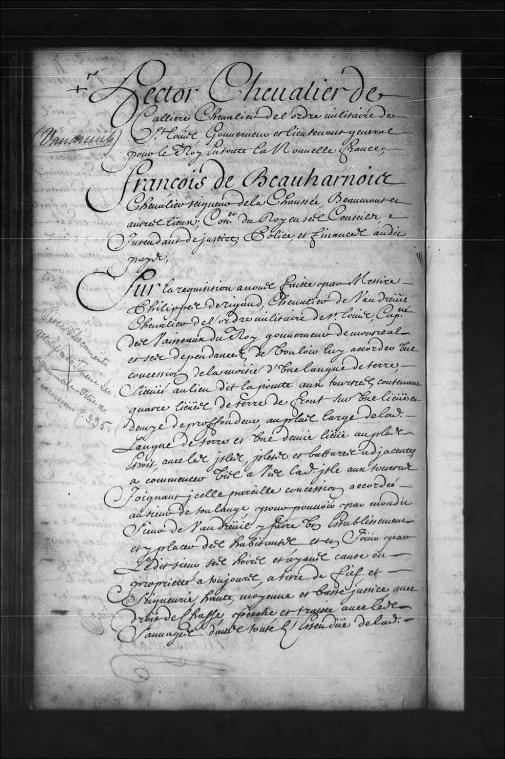 Concession par Louis-Hector de Callières et François de Boische de Beauharnois, gouverneur et intendant de la Nouvelle-France, au sieur Philippe de Rigaud, Chevalier de Vaudreuil, gouverneur de Montréal, de la moitié d'une langue de terre au lieu dit la pointe aux Tourtes contenant quatre lieues de terre de front sur une lieue et demie de profondeur au plus large de ladite langue de terre et une demi-lieue au plus étroit, avec les îles et îlets adjacents
