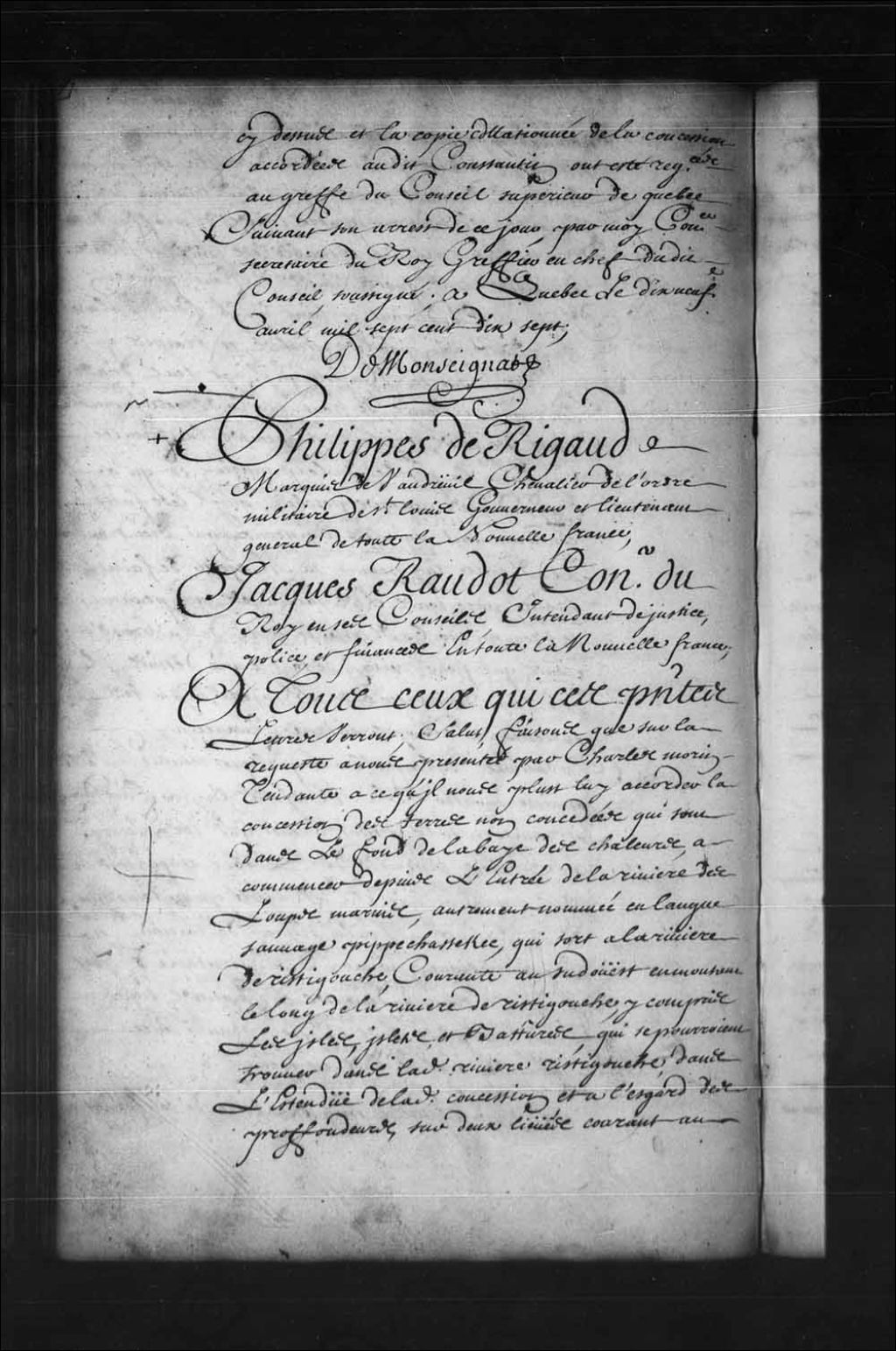 Concession par Philippe de Rigaud, Marquis de Vaudreuil, et Michel Bégon, gouverneur et intendant de la Nouvelle-France, à Charles Morin des terres non concédées qui sont dans le fond de la baie des Chaleurs, à commencer depuis l'entrée de la rivière des Loups marins, autrement nommée en langue sauvage Pippechassekec, qui sort à la rivière de Ristigouche, courant au sud-ouest en montant le long de la rivière de Ristigouche, laquelle concession comprenant en outre les îles, îlets et battures qui pourraient se trouver dans ladite rivière Ristigouche dans l'étendue de ladite concession, et à l'égard des profondeurs sur deux lieues courant au nord nord-ouest, sur deux lieues de front, courant au sud-ouest le long de ladite rivière Ristigouche, laquelle concession portera le nom de Cloridan