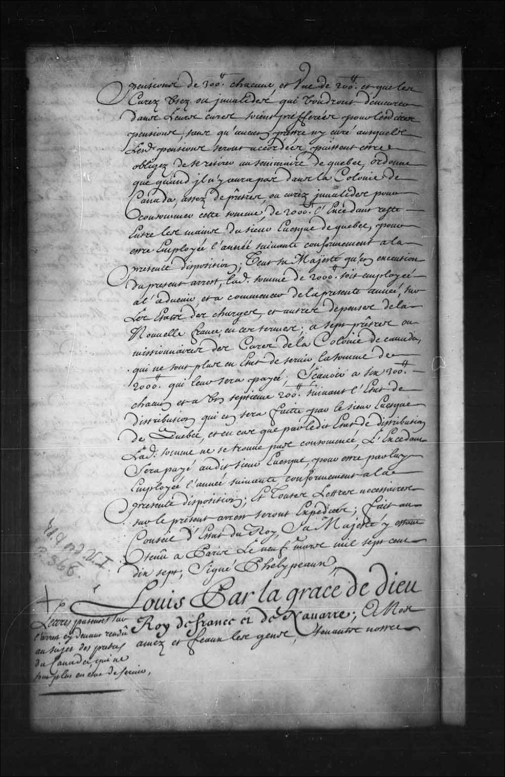 Lettres patentes du Roi au sujet de l'arrêt de Son Conseil d'État de ce jour sur les états des dépenses de la Nouvelle-France et sur la manière dont se fera à l'avenir la distribution des 2 000 livres employées annuellement sur l'état des charges et autres dépenses de la Nouvelle-France pour les prêtres qui ne sont plus en état de servir, 9 mars 1717, Archives nationales à Québec, Fonds Conseil souverain, (03Q,TP1,S36,P549).