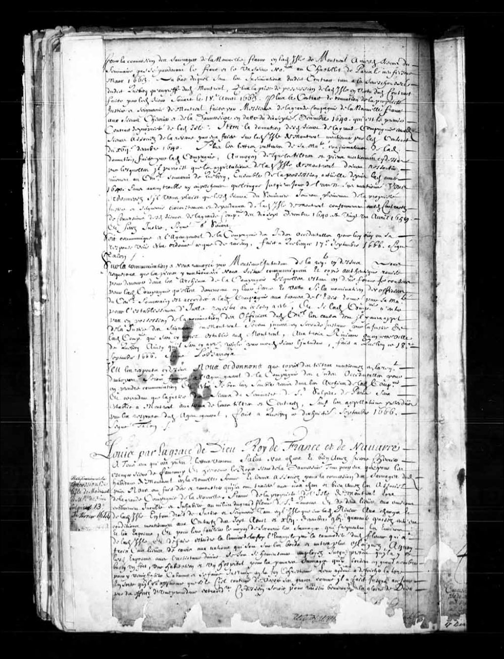 Ratification par le Roi des traités faits et passés les 7 août 1640 et 17 décembre 1640 au sujet de l'île de Montréal entre Pierre Chevrier, écuyer, sieur de Fancamp, et Jérôme Le Royer, sieur de la Dauversière, tant pour eux que pour les habitants de Montréal et leurs associés pour la conversion des Sauvages (Amérindiens) et les associés de la Grande Compagnie de la Nouvelle-France, 13 février 1644, Archives nationales à Québec, Fonds Conseil souverain, (03Q,TP1,S36,P55).