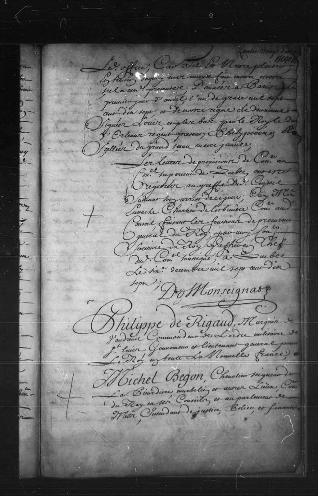 Acte de concession par Philippe de Rigaud, Marquis de Vaudreuil, et Michel Bégon, gouverneur et intendant en Nouvelle-France, à Marie-Anne Rivard, veuve du sieur François Dumontier, de son vivant premier secrétaire du Marquis de Vaudreuil, d'un emplacement sis rue Saint-Louis en la Haute-Ville de Québec et contenant quarante-cinq pieds de front sur cent dix-neuf pieds de profondeur du coté attenant à l'emplacement de Pierre Gacien dit Tourangeau (Gatien) et sur cent vingt-six pieds de l'autre coté faisant face au bastion du sud-ouest du fort Saint-Louis qui se termine par une ligne diagonale aboutissant à l'emplacement du nommé Laramée