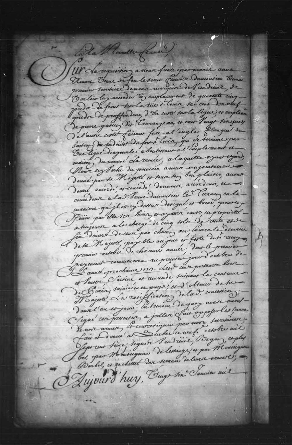 Brevet de confirmation par le Roi en faveur de Marie-Anne Rivard, veuve de François Dumontier, de la concession lui ayant été accordée le 9 octobre 1716 par Philippe de Rigaud, Marquis de Vaudreuil, et Michel Bégon, gouverneur et intendant en Nouvelle-France