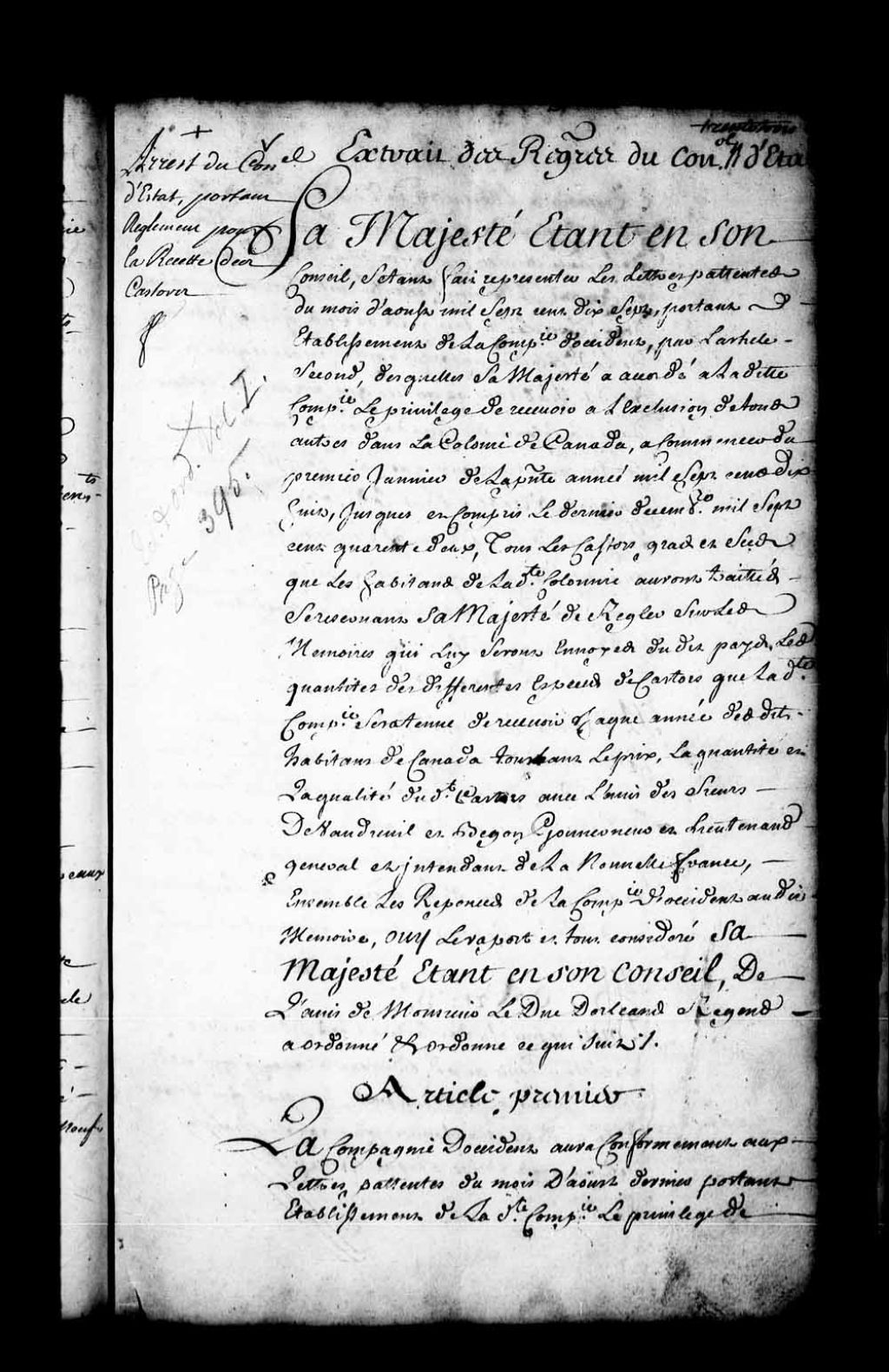 Arrêt du Conseil d'État du Roi portant règlement pour la recette des castors qui a été accordée à l'exclusion de tout autre, dans la colonie du Canada, à la Compagnie d'Occident (20 articles), 11 juillet 1718, Archives nationales à Québec, Fonds Conseil souverain, (03Q,TP1,S36,P575).