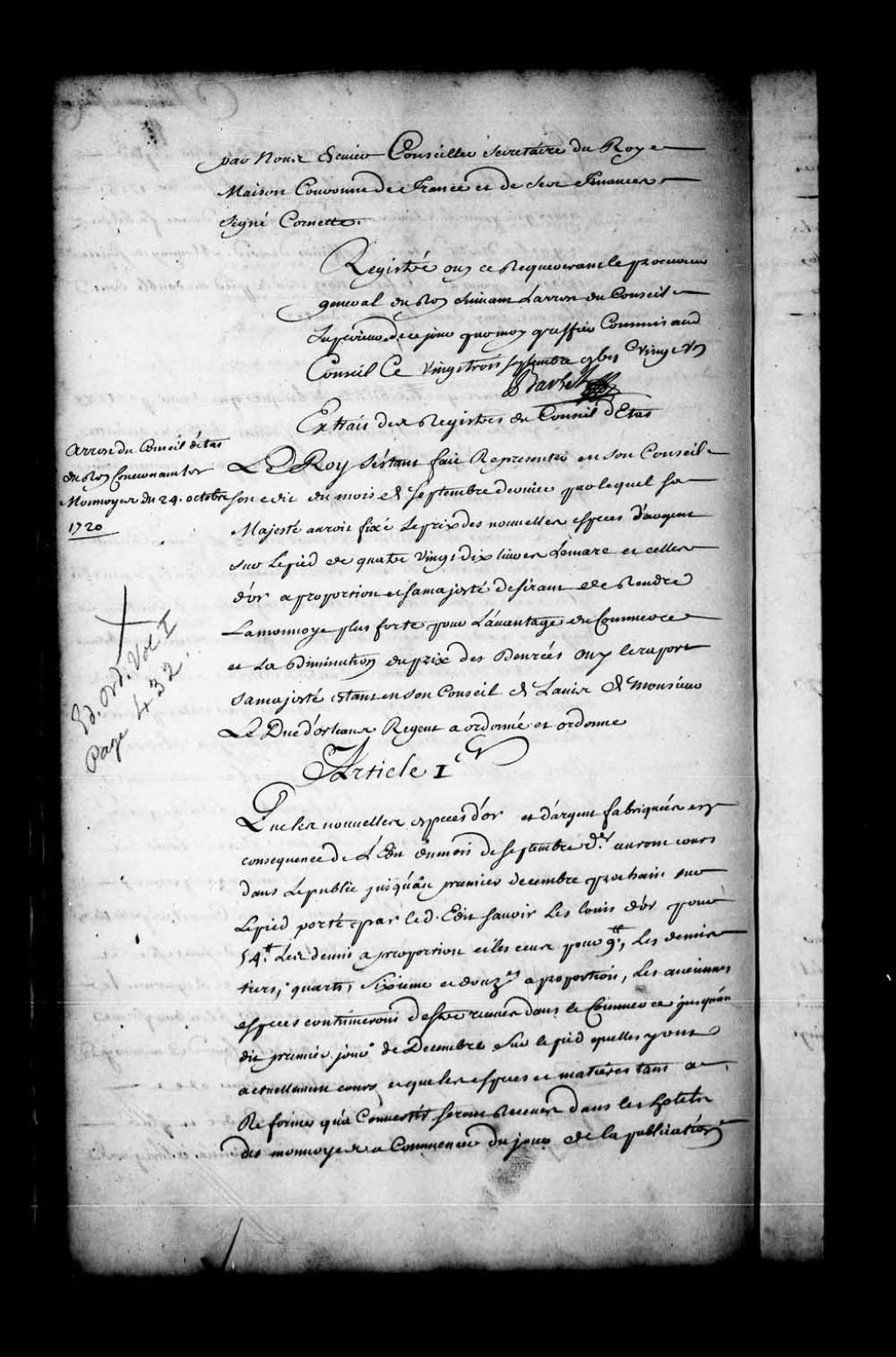 Arrêt du Conseil d'État du Roi au sujet des monnaies, 24 octobre 1720, Archives nationales à Québec, Fonds Conseil souverain, (03Q,TP1,S36,P609).