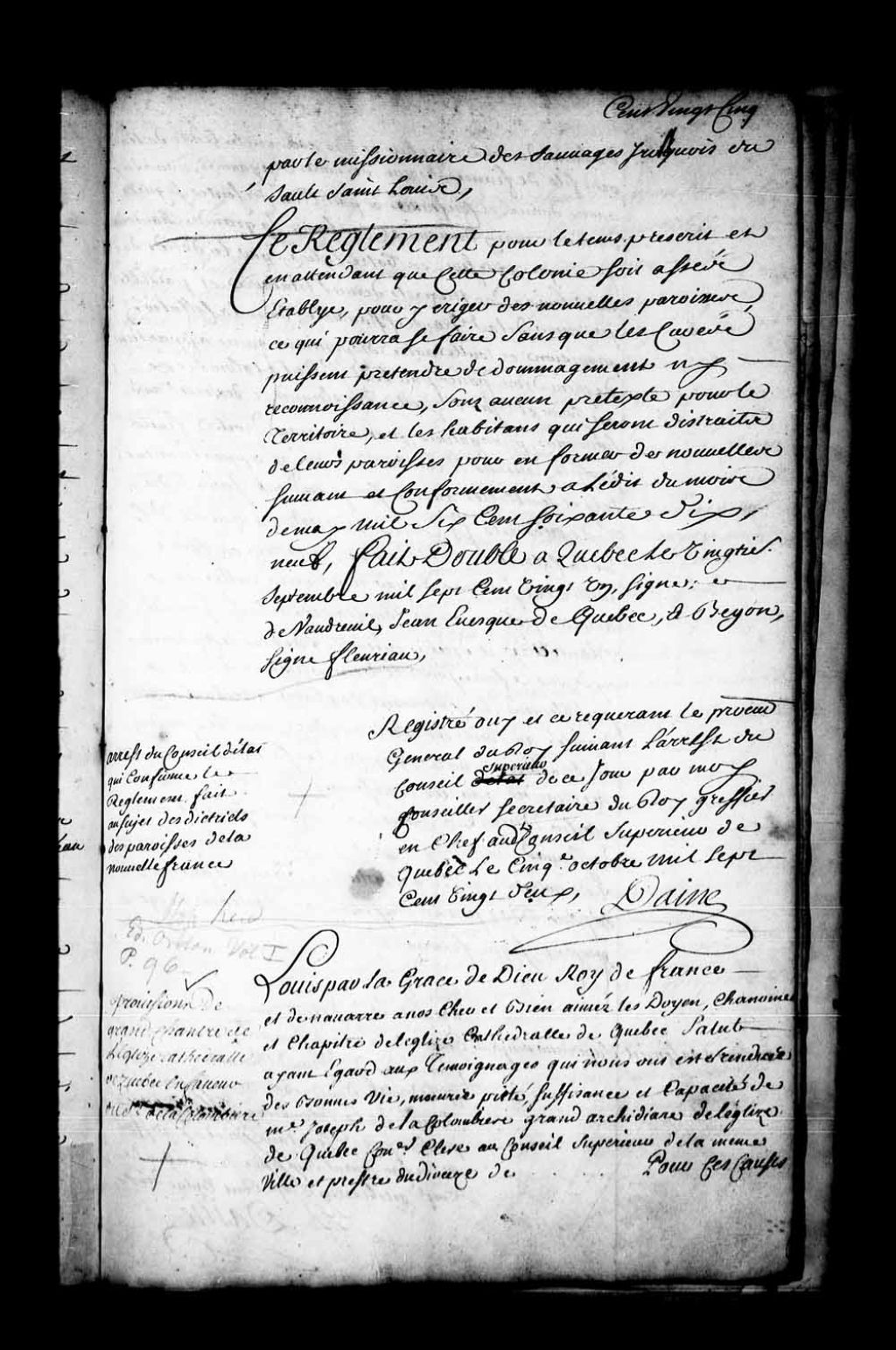 Lettres de provisions par le Roi de la charge de grand-chantre du chapitre de l'église cathédrale de Québec pour Monseigneur Joseph de la Colombière (LaColombière), grand archidiacre de l'église de Québec, conseiller clerc au Conseil supérieur de Québec, en remplacement du sieur Louis des Maizerets, décédé, 11 janvier 1722, Archives nationales à Québec, Fonds Conseil souverain, (03Q,TP1,S36,P617).