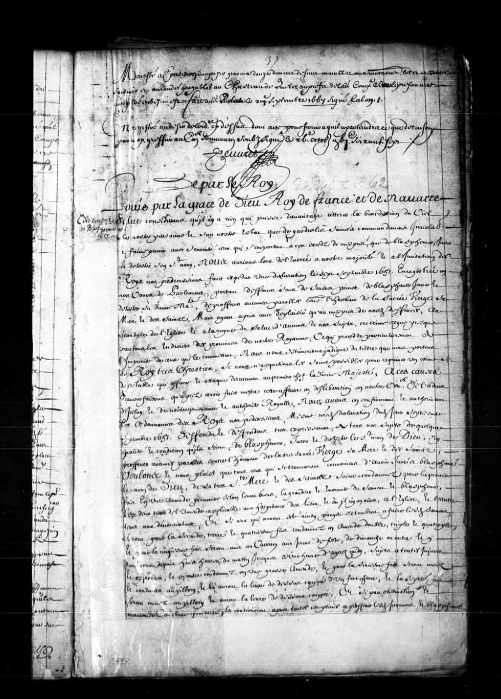 Édit du Roi contre les blasphémateurs, 30 juillet 1666, Archives nationales à Québec, Fonds Conseil souverain, (03Q,TP1,S36,P69).