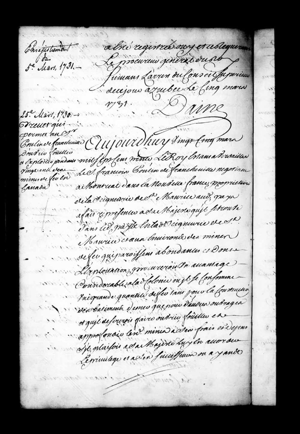 Brevet de Sa Majesté permettant au sieur Poulin de Francheville d'exploiter pendant vingt ans les mines de la seigneurie de Saint-Maurice, 25 mars 1730, Archives nationales à Québec, Fonds Conseil souverain, (03Q,TP1,S36,P708).