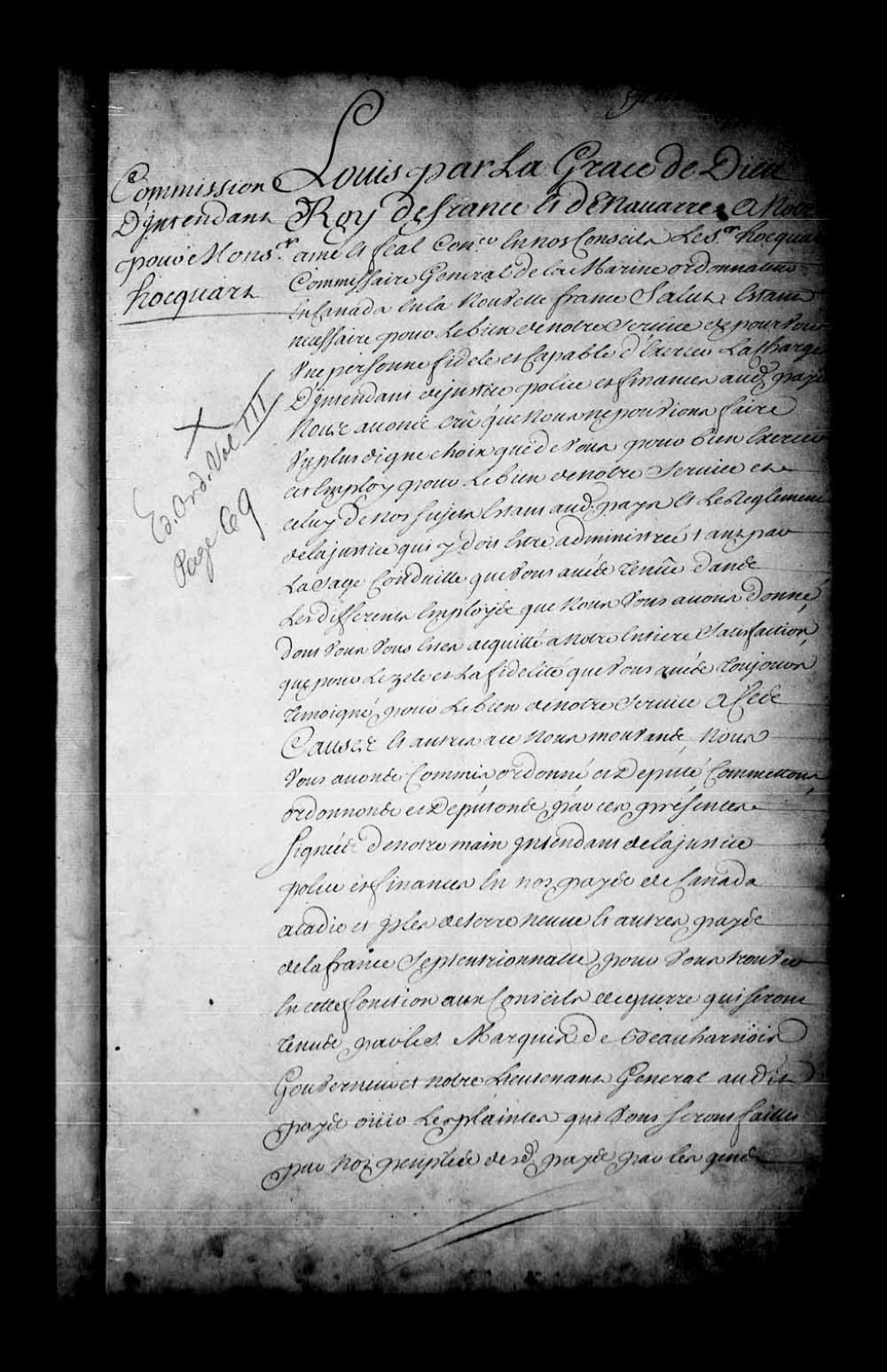 Lettres de provisions par Sa Majesté de la charge d'intendant de la justice, police et finances aux pays de Canada, Acadie, île de Terre-Neuve et autres pays de la France septentrionale pour le sieur Gilles Hocquart, commissaire général de la Marine, ordonnateur en la Nouvelle-France, 21 février 1731, Archives nationales à Québec, Fonds Conseil souverain, (03Q,TP1,S36,P710).