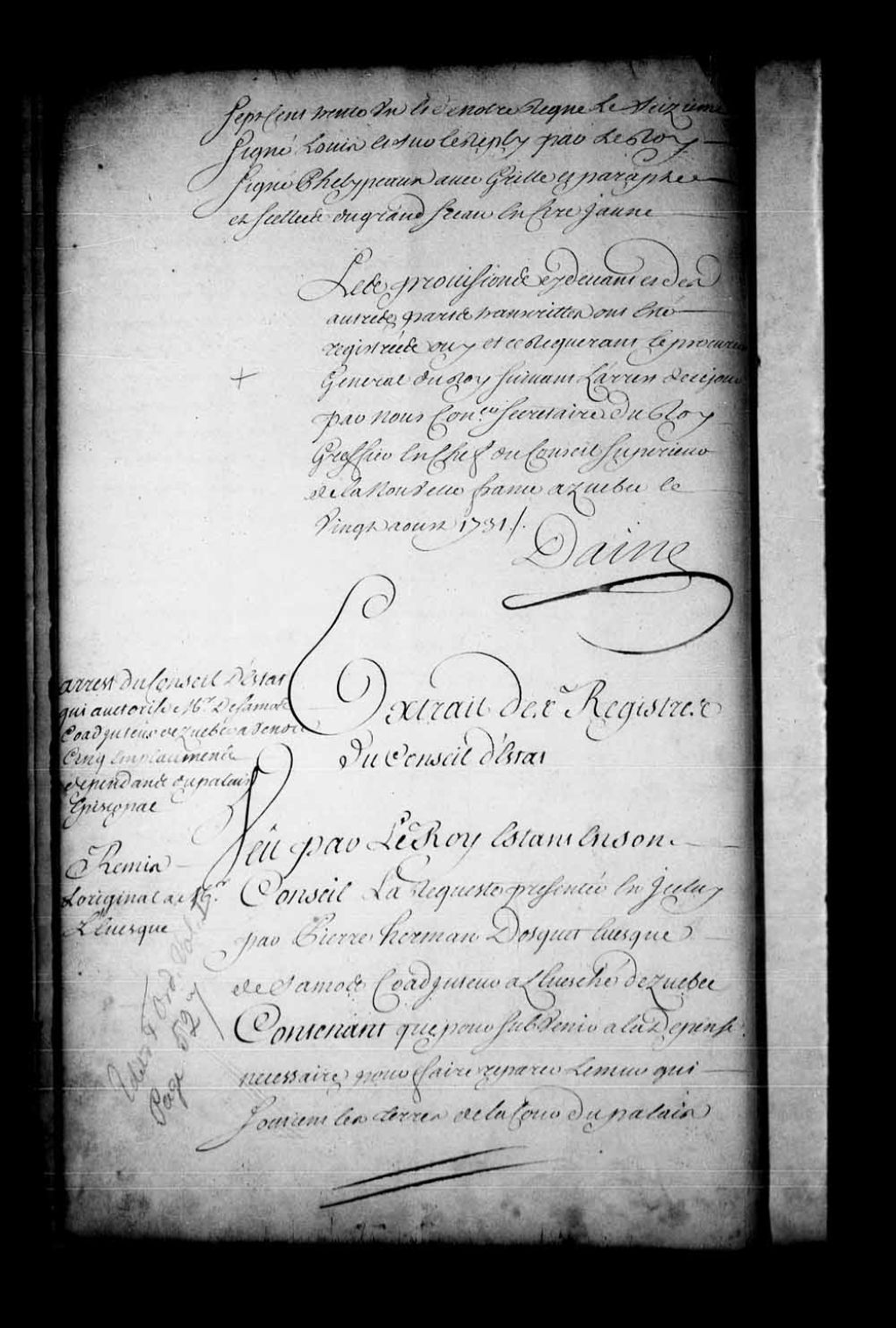 Arrêt du Conseil d'État du Roi autorisant Pierre-Herman Dosquet, évêque de Samos, coadjuteur à l'évêque de Québec, à vendre cinq emplacements dépendant du palais épiscopal de Québec afin de subvenir à la dépense nécessaire pour faire réparer le mur qui soutient les terres de la cour dudit palais épiscopal du côté du sud et pour faire faire les autres murs de clôture de l'enceinte, 17 février 1731, Archives nationales à Québec, Fonds Conseil souverain, (03Q,TP1,S36,P713).