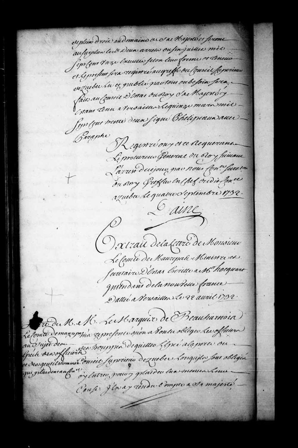 Lettre du comte de Maurepas, ministre et secrétaire d'État, au sieur Gilles Hocquart, intendant de la Nouvelle-France, au sujet des officiers des troupes et des gentilshommes qui plaident devant le Conseil supérieur, l'épée au côté, 22 avril 1732, Archives nationales à Québec, Fonds Conseil souverain, (03Q,TP1,S36,P723).