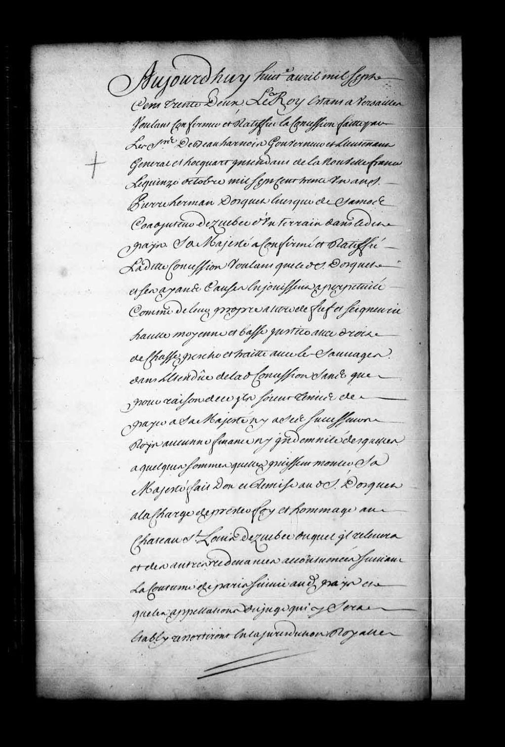 Brevet de confirmation par Sa Majesté en faveur de Monseigneur Pierre-Herman Dosquet, évêque de Samos et coadjuteur de Québec, de la terre et seigneurie lui ayant été accordée le 15 octobre 1731 par Charles de Boische, Marquis de Beauharnois, et Gilles Hocquart, gouverneur et intendant de la Nouvelle-France, 8 avril 1732, Archives nationales à Québec, Fonds Conseil souverain, (03Q,TP1,S36,P727).