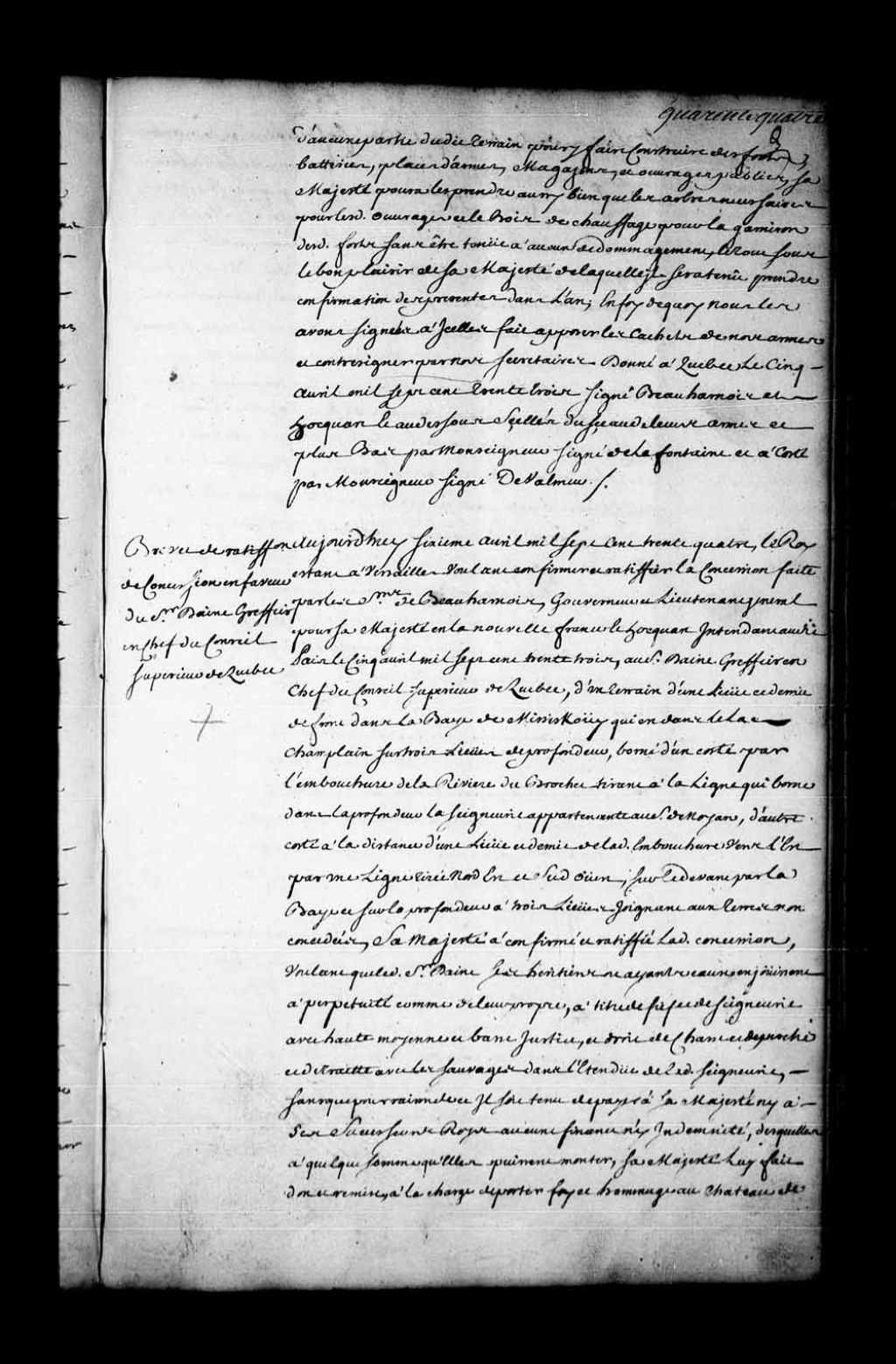 Brevet de confirmation et de ratification par Sa Majesté en faveur du sieur Daine, greffier en chef du Conseil supérieur de Québec, de la concession lui ayant été accordée le 5 avril 1733 par Charles de Boische, Marquis de Beauharnois, et Gilles Hocquart, gouverneur et intendant de la Nouvelle-France, 6 avril 1734, Archives nationales à Québec, Fonds Conseil souverain, (03Q,TP1,S36,P741).