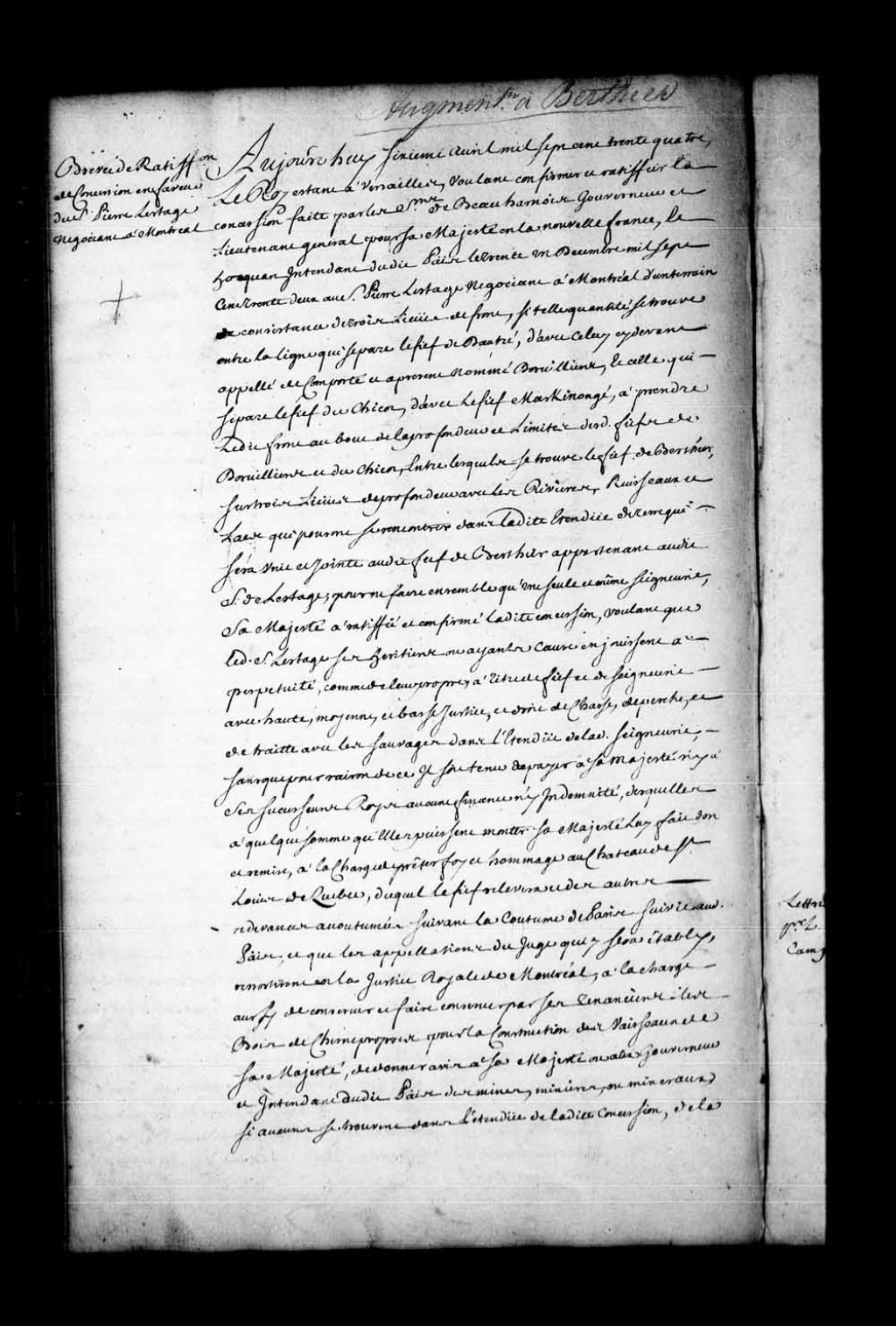 Brevet de confirmation et de ratification par Sa Majesté en faveur du sieur Pierre Lestage, négociant de Montréal, de la concession lui ayant été faite le 31 décembre 1732 par Charles de Boische, Marquis de Beauharnois, et Gilles Hocquart, gouverneur et intendant de la Nouvelle-France, d'un terrain de trois lieues de front, si telle quantité se trouve entre la ligne qui sépare le fief de Dautré (Dautray, d'Autray) d'avec celui auparavant appelé de Comporté et à présent nommé Dorvilliers (d'Orvilliers), et celle qui sépare le fief du Chicot d'avec le fief Maskinongé, à prendre ledit front au bout de la profondeur et limite desdits fiefs de Dorvilliers et du Chicot, entre lesquels se trouve le fief de Berthier, sur trois lieues de profondeur avec les rivières, ruisseaux et lacs se rencontrant dans ladite étendue de terre qui sera unie et jointe audit fief de Berthier appartenant au sieur de Lestage pour ne faire ensemble qu'une seule et même seigneurie