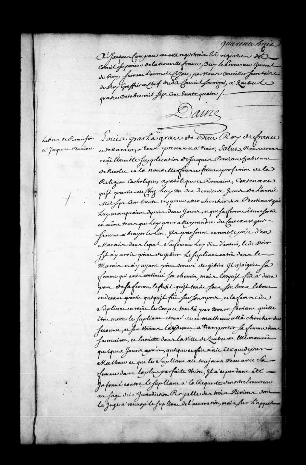 Lettres de rémission du Roi pour Jacques Daniau (Dagneau), habitant de Nicolet en la Nouvelle-France, faisant suite à une requête contenant qu'il partit de chez lui un des derniers jours de l'année 1731 pour aller chercher des bestiaux qui lui manquaient depuis deux jours et que sa femme étant sortie en même temps que lui pour aller prendre des couteaux qui servent à brayer le lin, ils passèrent ensemble près d'un marais dans lequel sa femme lui dit d'entrer et de voir s'il n'y avait point de gibier, à la suite de quoi il entra dans le marais et n'y ayant point trouvé de gibier, il rejoignit sa femme qui avait continué son chemin, mais lorsqu'il fut à deux pas de sa femme, le fusil qu'il tenait sous son bras le bout en devant partit quoiqu'il fût sur son repos, et la femme du suppliant en reçut le coup et tomba par terre en s'écriant qu'elle était morte; le suppliant étonné de ce malheur alla chercher du secours et ses voisins l'aidèrent à transporter sa femme dans sa maison et ensuite dans la ville de Québec où elle mourut quelques jours après; bien que ce fait n'ait été que de pur malheur et qu'il ait toujours vécu avec sa femme dans la plus parfaite union, il a cependant été informé contre le suppliant à la requête du procureur au siège de la Juridiction royale des Trois-Rivières dont le juge a renvoyé le suppliant de l'accusation, mais sur l'appel de la sentence interjeté par le procureur général au Conseil supérieur de Québec, il a été rendu le 9 avril 1732, arrêt qui a ordonné qu'il serait sursis au jugement du procès jusqu'à ce que le suppliant se fut pourvu à l'effet d'obtenir des lettres de grâce, 1er janvier 1734 - 31 janvier 1734, Archives nationales à Québec, Fonds Conseil souverain, (03Q,TP1,S36,P746).