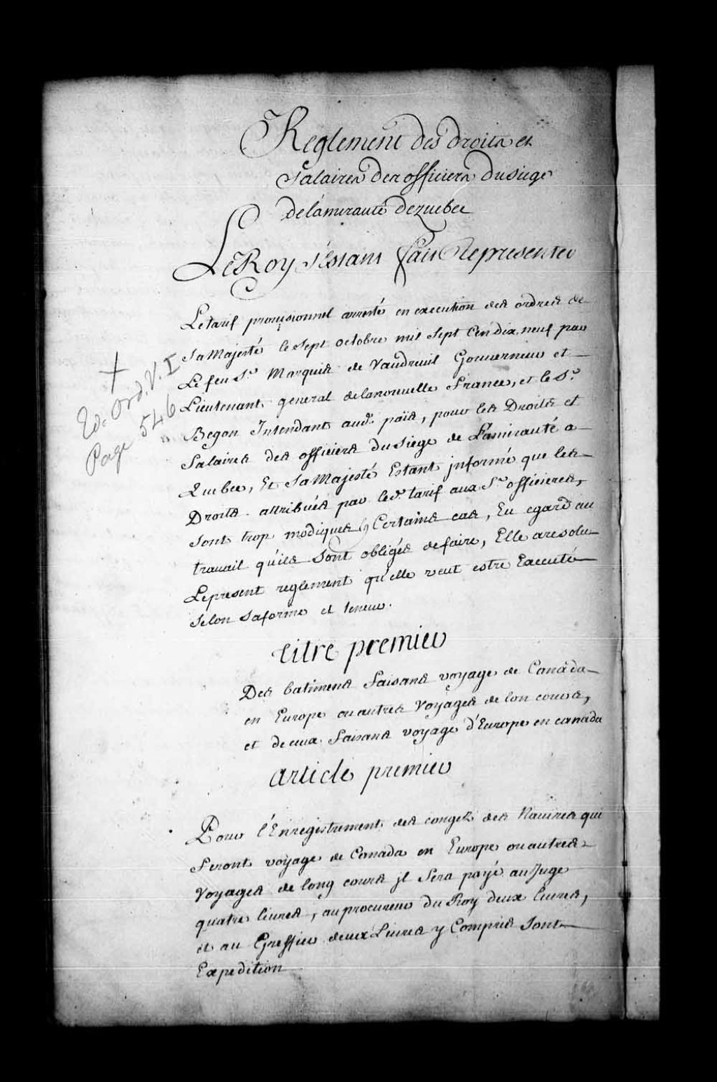 Règlement par Sa Majesté au sujet des droits et salaires des officiers du siège de l'Amirauté de Québec
