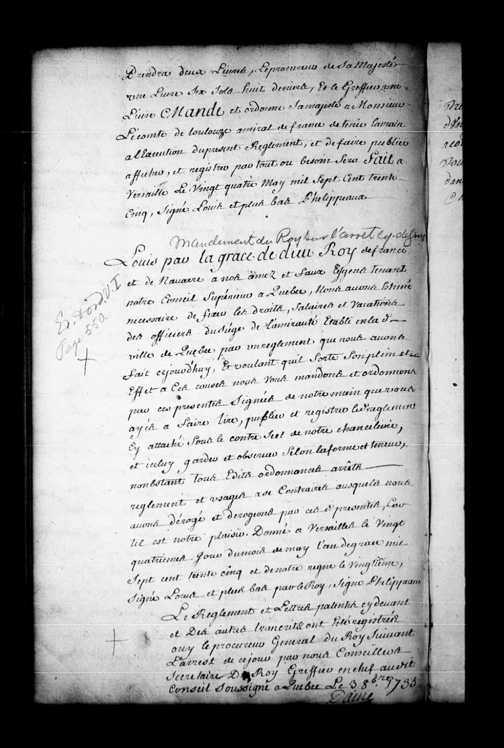 Mandement du Roi sur Son règlement du 24 mai 1735 fixant les droits et salaires des officiers de l'Amirauté de Québec