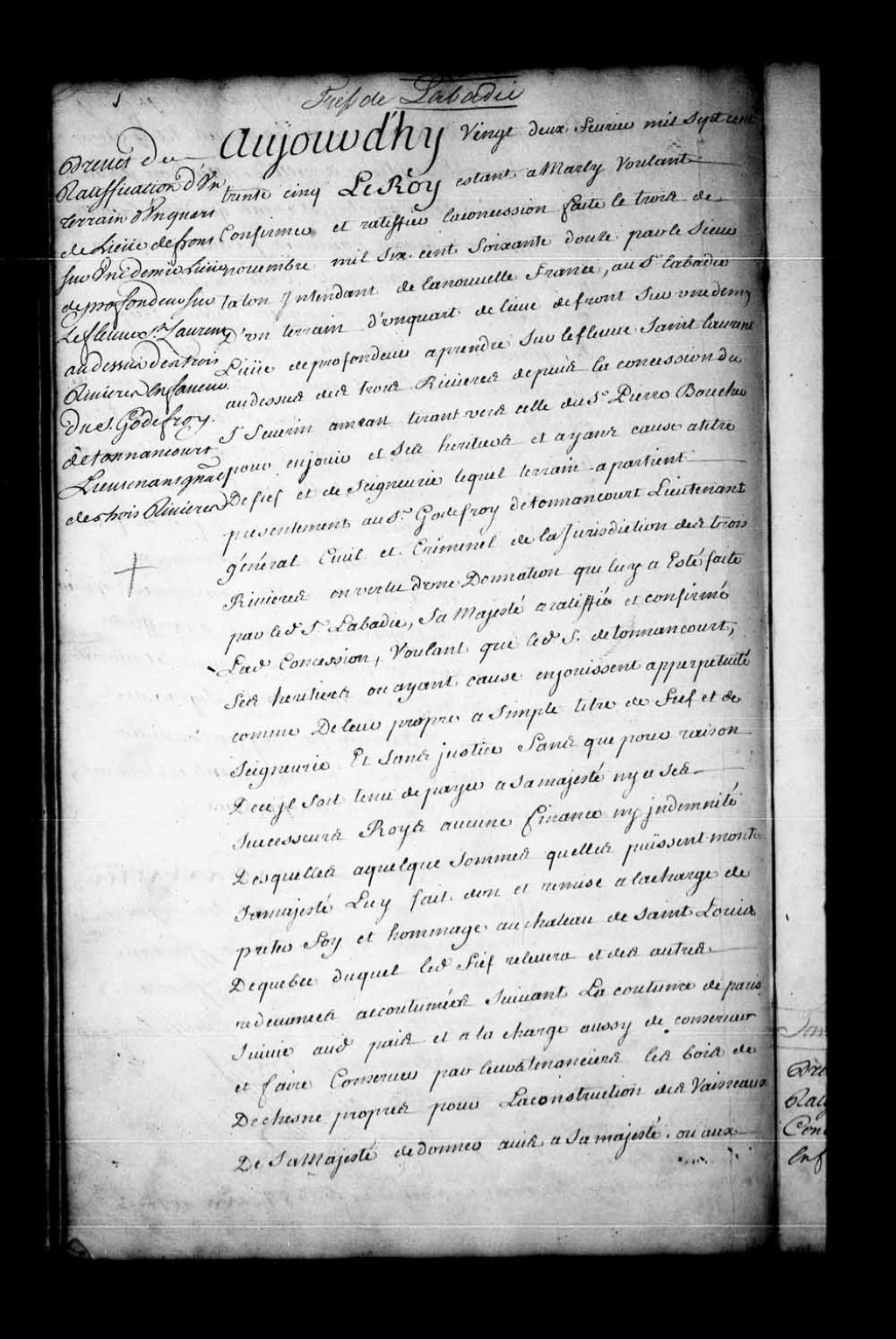 Brevet de confirmation et de ratification par Sa Majesté en faveur de René Godefroy de Tonnancour, lieutenant général civil et criminel de la Juridiction des Trois-Rivières, de la concession lui ayant été accordée le 3 novembre 1734 par Charles de Boische, Marquis de Beauharnois, et Gilles Hocquart, gouverneur et intendant de la Nouvelle-France, laquelle consistant en un terrain d'une demi-lieue de front sur une lieue de profondeur à prendre sur ledit front au bout de la profondeur du fief appelé de Normanville appartenant au sieur de Tonnancourt (Tonnancour), ladite prolongation en profondeur devant être unie et jointe audit fief et ne faire avec le fief et seigneurie de Sauvaget qu'une seule et même seigneurie sous le nom de Tonnancourt