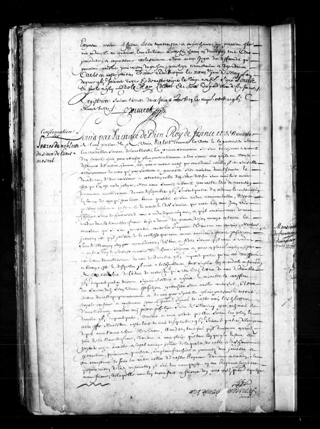 Confirmation de la noblesse de Jean-Vincent Philippe, sieur de Hautmesnil, 16 mars 1671, Archives nationales à Québec, Fonds Conseil souverain, (03Q,TP1,S36,P80).