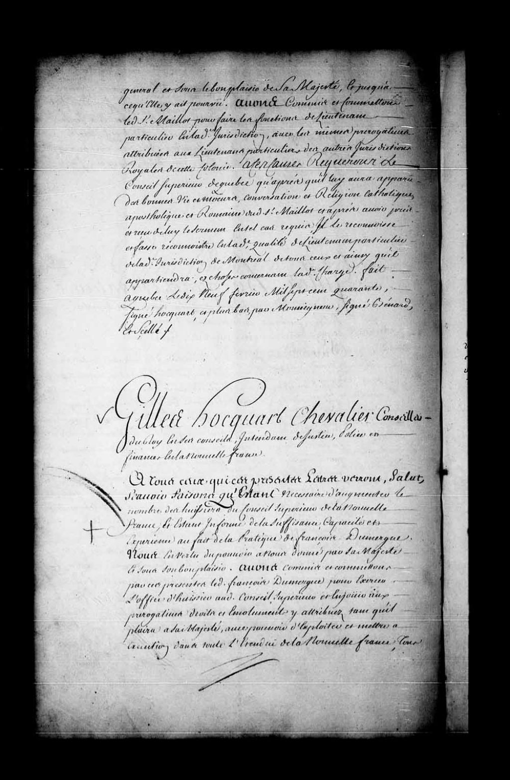Commission de Gilles Hocquart, intendant de la Nouvelle-France, à François Dumergue pour exercer l'office d'huissier au Conseil supérieur de Québec, 5 avril 1740, Archives nationales à Québec, Fonds Conseil souverain, (03Q,TP1,S36,P817).