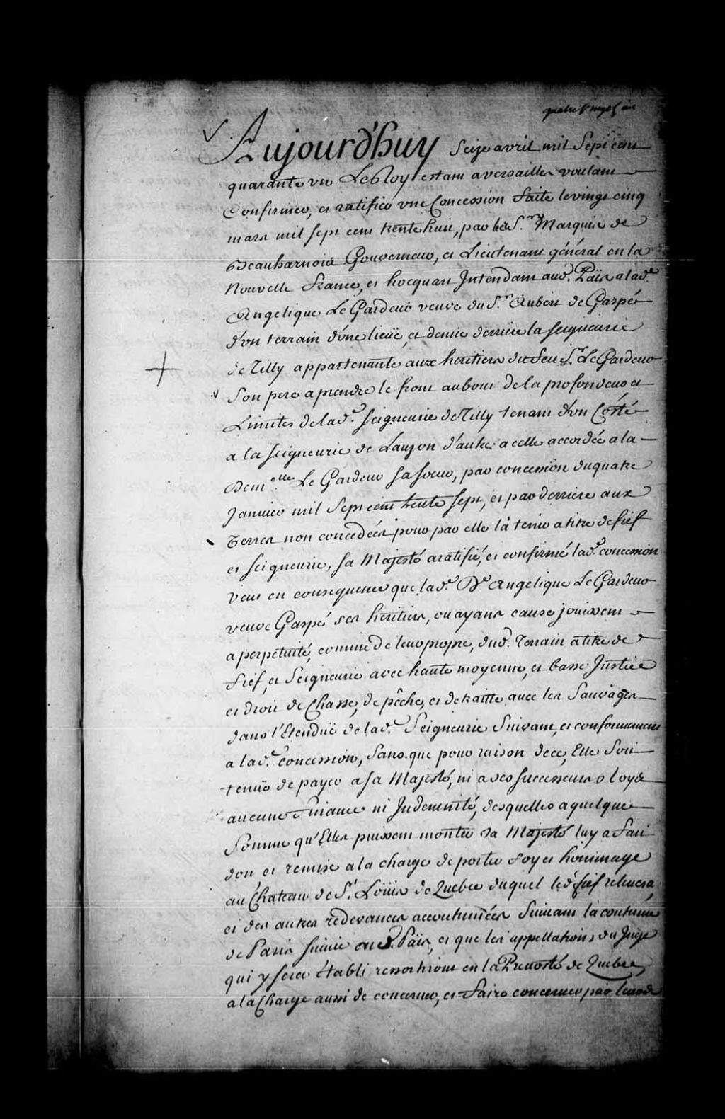 Brevet de confirmation et de ratification par Sa Majesté en faveur de la damoiselle Angélique LeGardeur (Le Gardeur), veuve du sieur Aubert de Gaspé, d'une concession lui ayant été faite le 25 mars 1738 par Charles de Boische, Marquis de Beauharnois, et Gilles Hocquart, gouverneur et intendant de la Nouvelle-France, laquelle concession consistant en un terrain d'une lieue et demie derrière la seigneurie de Tilly appartenant aux héritiers du feu sieur LeGardeur, son père, ledit front à prendre au bout de la profondeur et limites de ladite seigneurie de Tilly tenant d'un côté à la seigneurie de Lauzon, de l'autre à celle accordée à la damoiselle LeGardeur, sa soeur, par la concession du 4 janvier 1737, et par derrière aux terres non concédées, à titre de fief et seigneurie