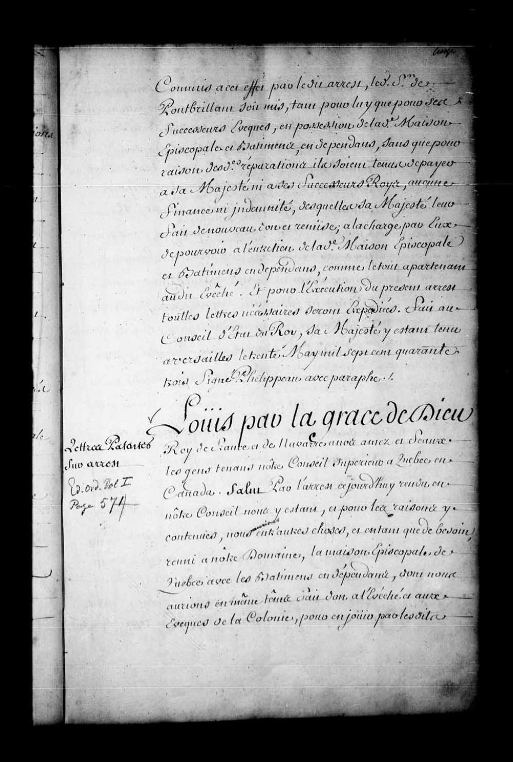 Lettres patentes de Sa Majesté sur l'arrêt de Son Conseil d'État du même jour réunissant la maison épiscopale de Québec au Domaine du Roi et en faisant don aux évêques de Québec, 30 mai 1743, Archives nationales à Québec, Fonds Conseil souverain, (03Q,TP1,S36,P854).