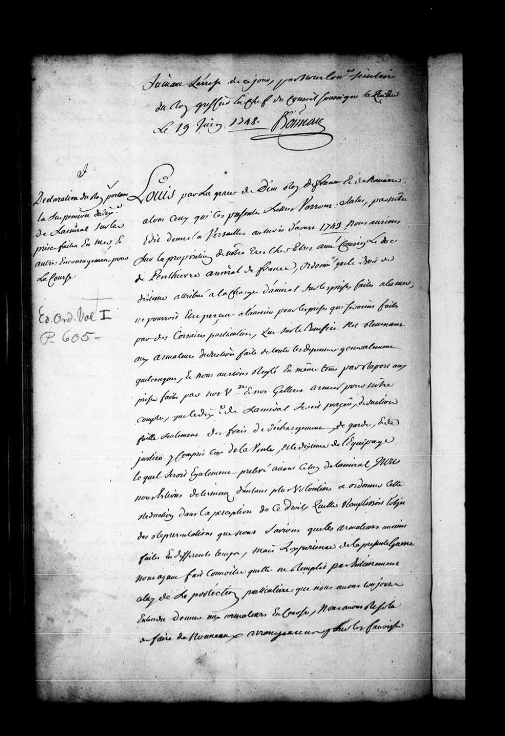 - Déclaration du Roi portant suspension du dixième de l'amiral de France sur les prises faites en mer et donnant d'autres encouragements pour la course