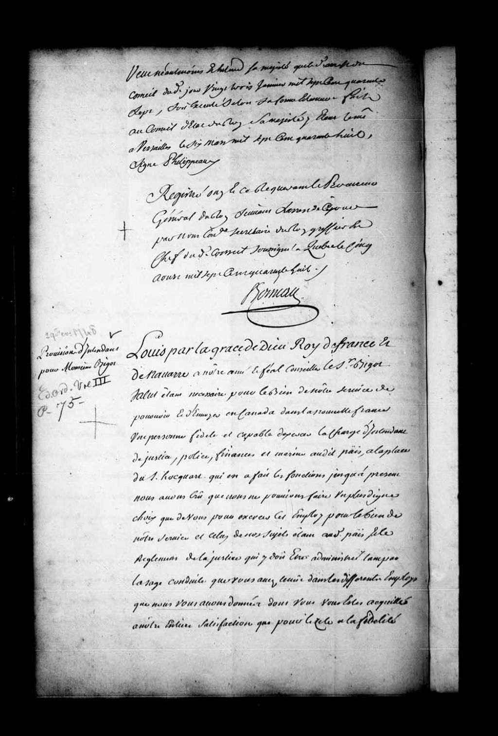 - Lettres de provisions par Sa Majesté de la charge d'intendant de justice, police et finances au pays de Canada pour le sieur François Bigot, à la place du sieur Gilles Hocquart