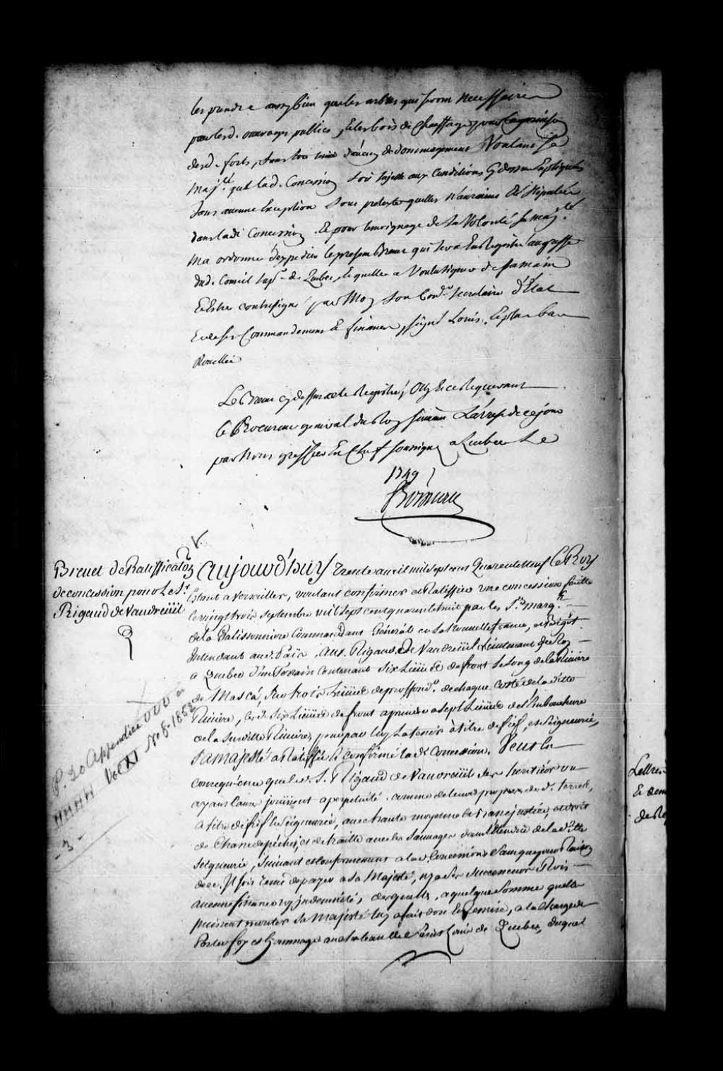 Brevet de confirmation et de ratification par Sa Majesté en faveur du sieur Rigaud de Vaudreuil, lieutenant de Roi à Québec, d'une concession lui ayant été faite le 23 septembre 1748 par Roland-Michel Barrin, Marquis de la Galissonière, et François Bigot, commandant général et intendant de la Nouvelle-France, laquelle concession consistant en un terrain contenant six lieues de front le long de la rivière Yamaska, sur trois lieues de profondeur de chaque côté de ladite rivière, et six lieues de front à prendre à sept lieues de l'embouchure de ladite rivière, à titre de fief et seigneurie