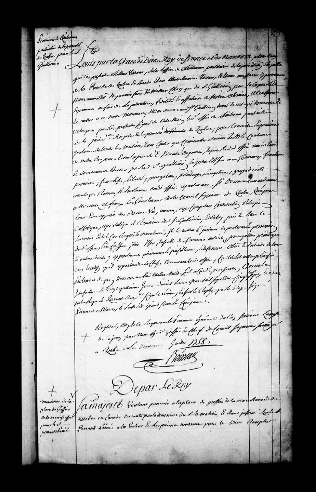 Commission par Sa Majesté au sieur Perrault l'aîné pour exercer l'office de greffier de la Maréchaussée de Québec, poste rendu vacant par la démission du sieur LaMaletie, 1er mars 1758, Archives nationales à Québec, Fonds Conseil souverain, (03Q,TP1,S36,P956).