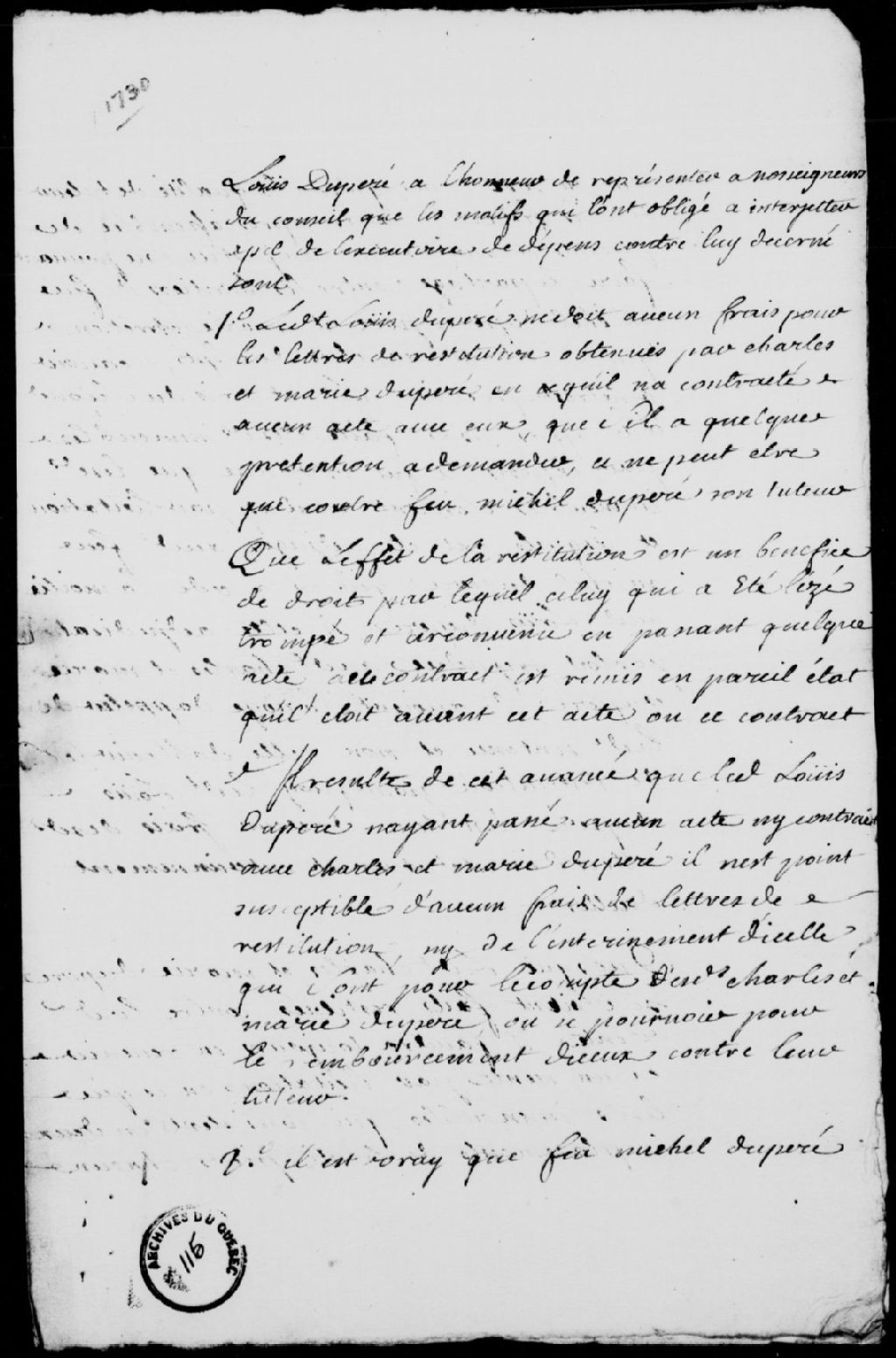 - Ce dossier comprend les griefs d'appel de Louis Dupéré, la requête au Conseil supérieur de Québec de Charles Dupéré, le jugement du Conseil supérieur de Québec en faveur dudit Charles Dupéré et trois significations audit Louis Dupéré. Copies d'extraits des registres du Conseil supérieur de Québec signées par Clesse, Dessaline (Dessalines) et Dubreuil