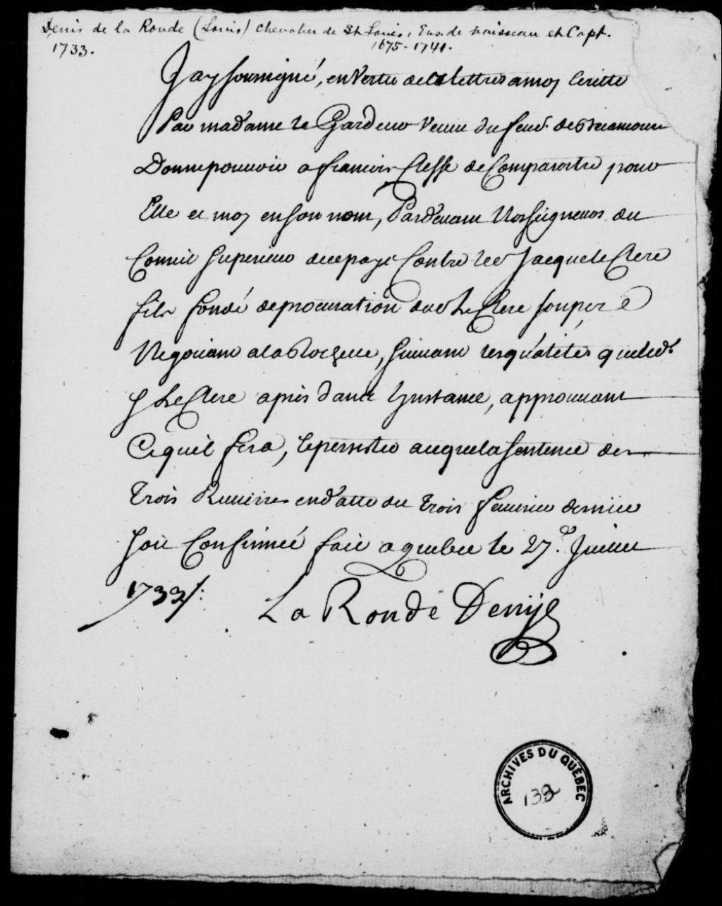 Procuration de Louis Denys de la Ronde (Denis de LaRonde), Chevalier de Saint-Louis, à François Clesse afin qu'il comparaisse devant le Conseil supérieur de Québec au nom de Marie-Charlotte Legardeur (Le Gardeur), veuve de Pierre Robineau de Bécancour, contre Jacques Leclerc, fondé de procuration de son père, négociant à La Rochelle, pour faire rejeter l'appel d'une sentence aux Trois-Rivières le 3 février 1732, appel mis à néant, 27 juillet 1733, Archives nationales à Québec, Fonds Conseil souverain, (03Q,TP1,S37,D132).