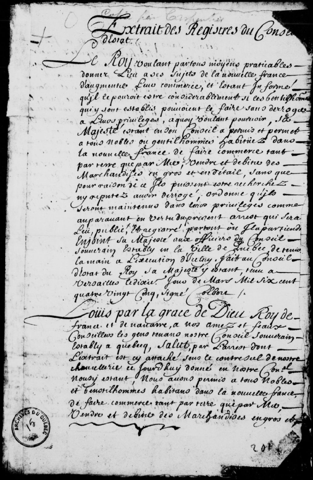 Arrêt d'enregistrement de l'arrêt du Conseil d'État du Roi permettant aux nobles et aux gentilshommes établis dans ce pays de faire le commerce tant par mer que par terre, de vendre et de débiter des marchandises en gros et en détail sans qu'ils puissent être recherchés et être maintenus dans leurs privilèges, 30 août 1685, Archives nationales à Québec, Fonds Conseil souverain, (03Q,TP1,S37,D15).