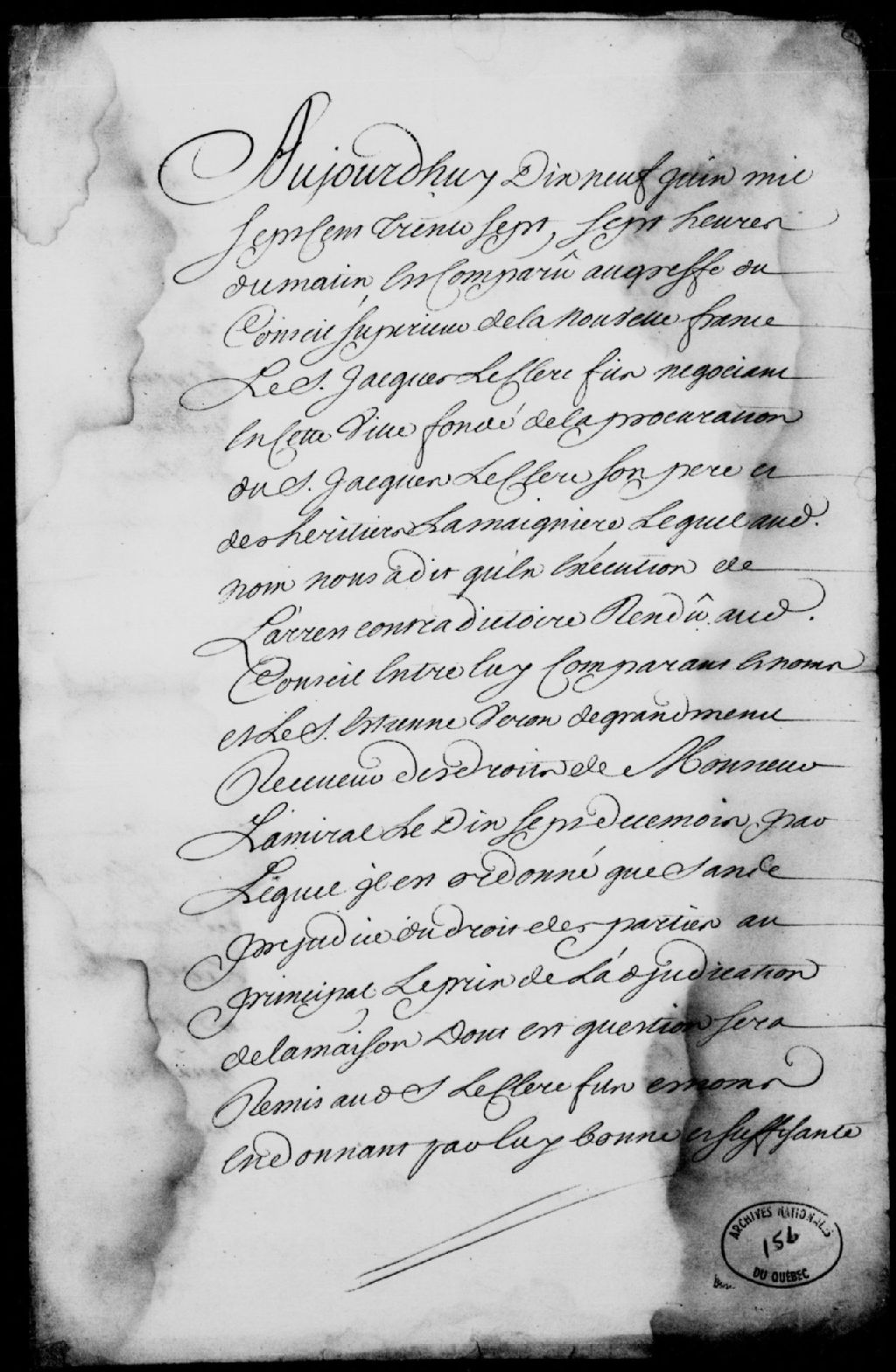 Procès-verbal établi au greffe du Conseil supérieur de Québec concernant la mésentente entre Jacques Leclerc, négociant de La Rochelle, et les héritiers Maignière, contre Étienne Véron de Grandmesnil, receveur des droits de Monsieur l'Amiral, à la suite d'un arrêt du Conseil supérieur de Québec; il est question de l'adjudication d'emplacement et de maison au détriment du créancier, 19 juin 1737, Archives nationales à Québec, Fonds Conseil souverain, (03Q,TP1,S37,D156).