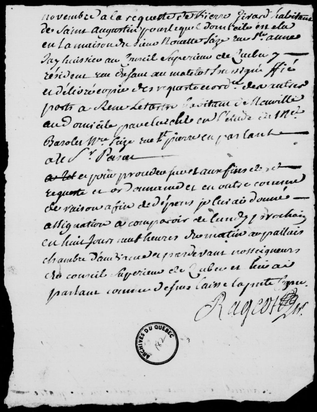 Requête de Pierre Girard, habitant de Saint-Augustin, pour prévenir l'appel de René Letartre, habitant de la Pointe-aux-Trembles, de la sentence rendue en la Prévôté de Québec le 5 septembre 1741; requête accordée par Chartier de Lotbinière; signification à René Letartre, 3 novembre 1741, Archives nationales à Québec, Fonds Conseil souverain, (03Q,TP1,S37,D182).