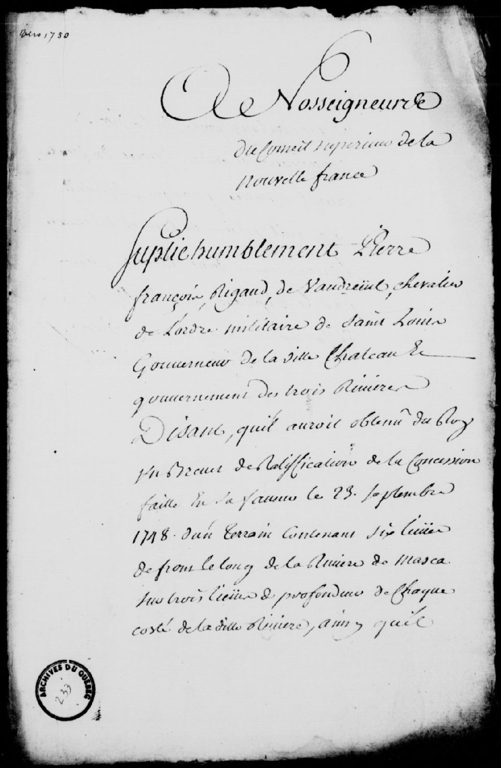 Requête pour que la concession (ratifiée par le Roi) faite à Pierre-François Rigaud de Vaudreuil, Chevalier de l'Ordre militaire de Saint-Louis, sur la Yamaska soit enregistrée, 1er septembre 1749, Archives nationales à Québec, Fonds Conseil souverain, (03Q,TP1,S37,D233).