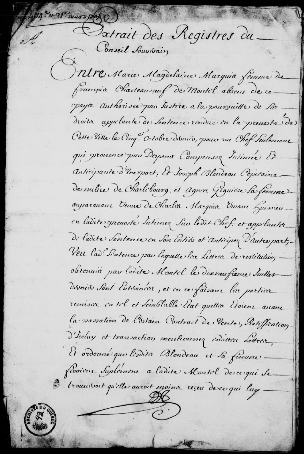 - Appel de Marie-Madeleine Marquis, femme de François de Châteauneuf Morel, contre Joseph Blondeau, capitaine de milice de Charlesbourg, et Agnès Giguère, mis au néant; déboutant ladite Marquis des lettres de restitution qu'elle a obtenues le 19 juillet 1706