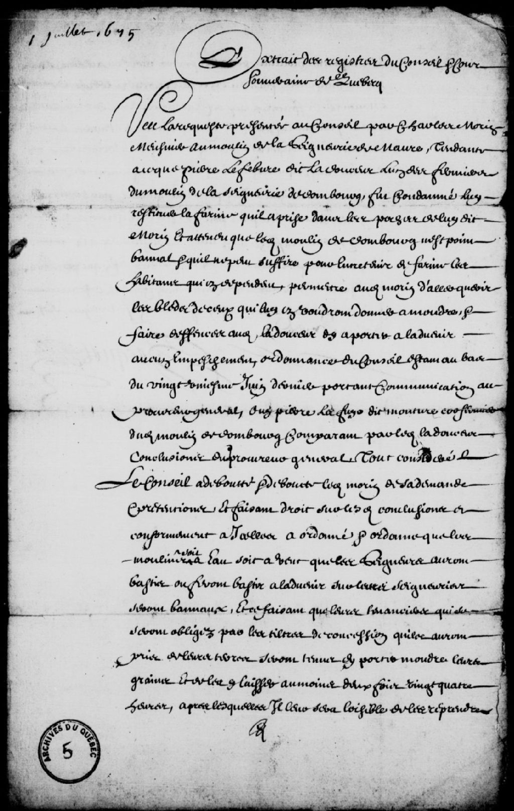 Ordonnance du Conseil souverain de Québec à l'effet que les moulins que les seigneurs auront bâtis ou feront bâtir sur leur seigneurie, qu'ils soient à vent ou à eau, seront banaux, 1er juillet 1675, Archives nationales à Québec, Fonds Conseil souverain, (03Q,TP1,S37,D5).