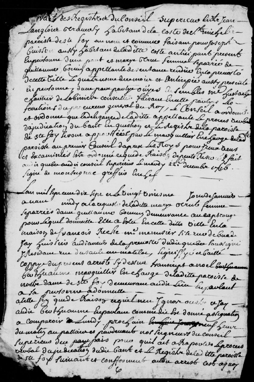 Ordre à Noël Berthiaume, marguillier à Sainte-Foy, de produire le procès-verbal d'adjudication d'un banc d'église et le registre paroissial: Marie Trut (Tru, Trud) en appelle de la sentence de la Prévôté du 4 décembre 1716 dans sa cause contre Jean Langlois Traversy; signification à Noël Berthiaume, 22 décembre 1716, Archives nationales à Québec, Fonds Conseil souverain, (03Q,TP1,S37,D63).