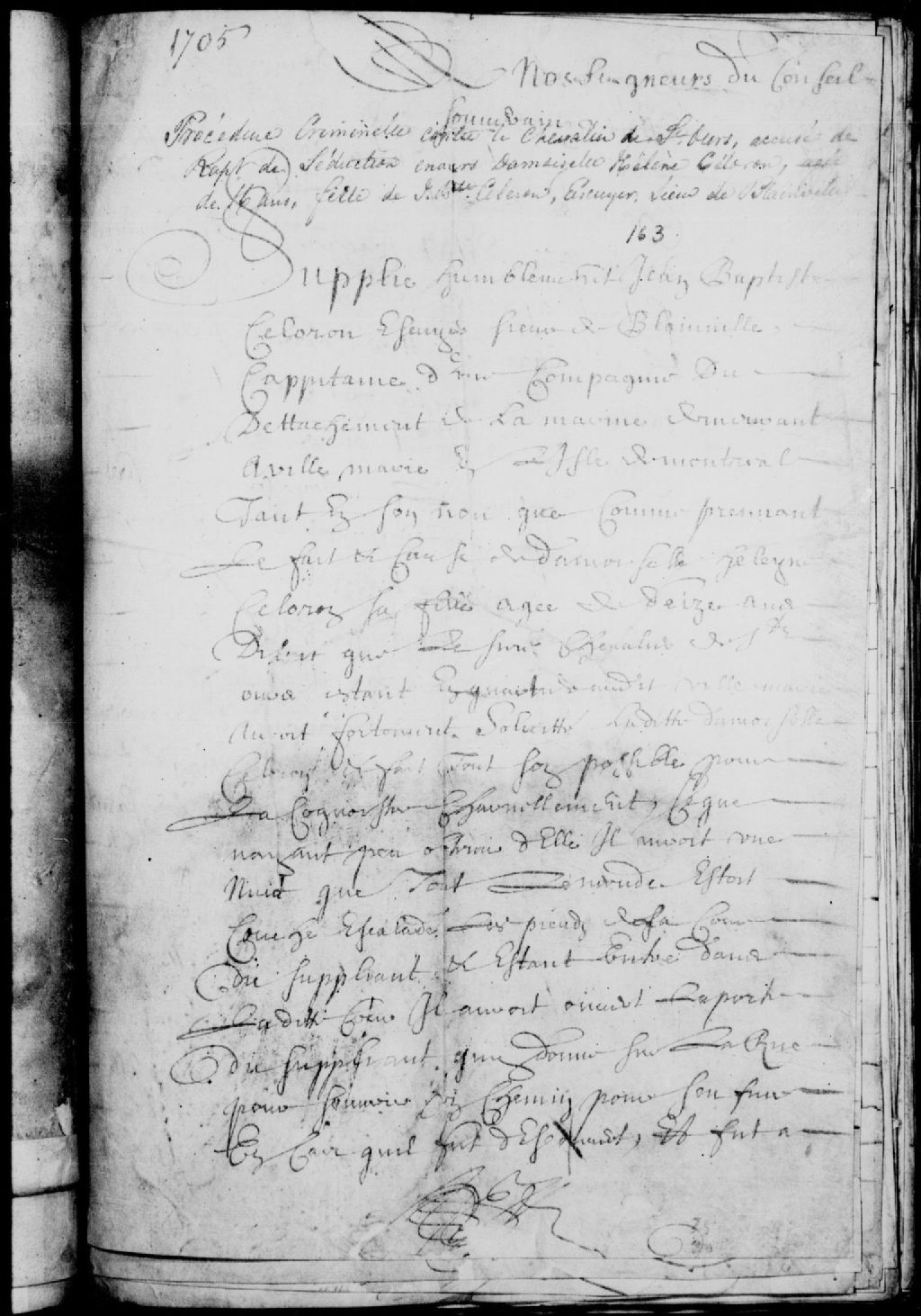 - Procès entre Jean-Baptiste Celoron, sieur de Blainville, écuyer, capitaine d'une compagnie du détachement de la Marine, demeurant à Ville-Marie, et sa fille Hélène (16 ans), demandeurs, et Pierre de Saint-Ours, 28-29 ans, écuyer, seigneur de Saint-Ours d'où il est natif, officier dans les troupes du détachement de la Marine, en garnison à Ville-Marie, demeurant dans la maison de monsieur René Legardeur, sieur de Beauvais, de Tilly, son beau-frère, écuyer, lieutenant d'une compagnie des troupes, sur la Place d'Armes (Place Royale) de Ville-Marie, défendeur, accusé de rapt et de viol sur ladite Hélène