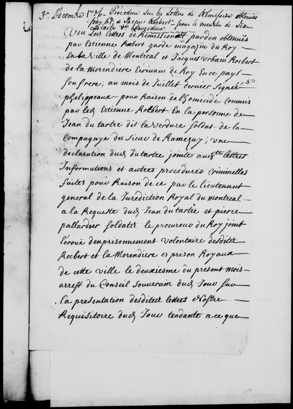 Procès d'Étienne Rocbert, 37-38 ans, garde-magasin du Roi à Montréal, demeurant ordinairement au magasin, et Jacques-Urbain Rocbert, sieur de LaMorandière (la Morandière), 38-39 ans, écrivain du Roi au département de Montréal, demeurant dans le magasin de Sa Majesté, frères, prisonniers, le premier étant accusé d'homicide sur la personne de Jean Dutartre dit Laverdure, soldat de la compagnie du sieur de Ramezay, lors d'une altercation entre les deux frères et deux soldats dont la victime et Pierre Pallardier dit Lamarine (la Marine)