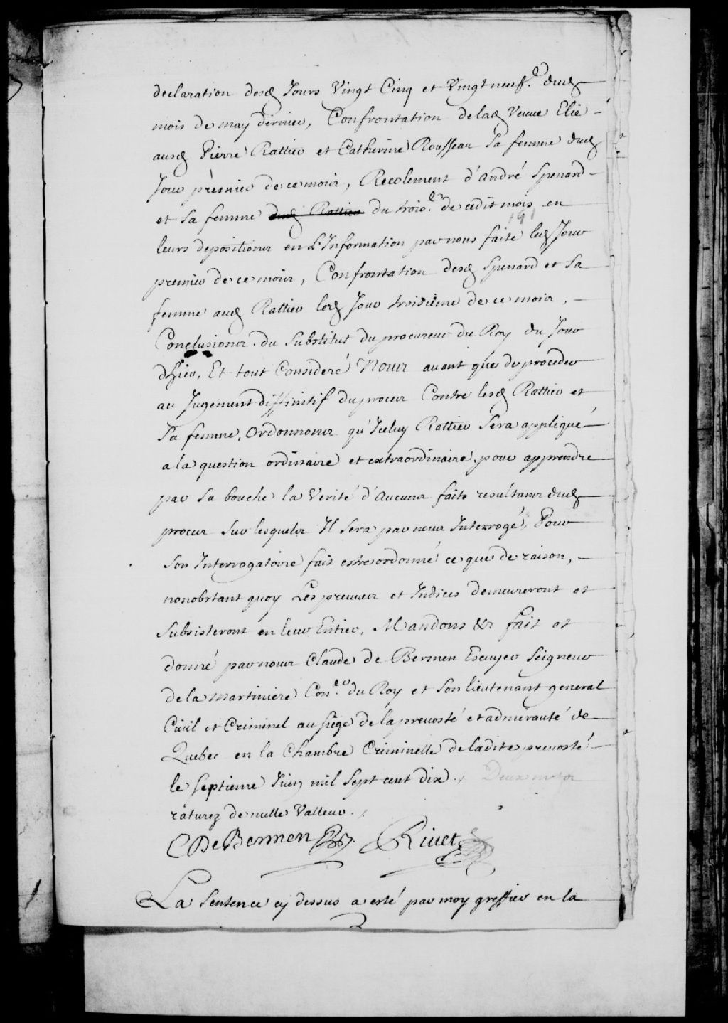 Procès entre Marie-Josèphe Maréchal, veuve de feu Jacques Élie, maître des hautes oeuvres de Québec (bourreau), demanderesse, et Pierre Ratier (Rattier), environ 28 ans, journalier, demeurant à Québec, et Catherine Rousseau, sa femme, défendeurs, accusés de divers vols à la Maison Blanche, 1er juin 1710 - 7 juin 1710, Archives nationales à Québec, Fonds Conseil souverain, (03Q,TP1,S777,D132).