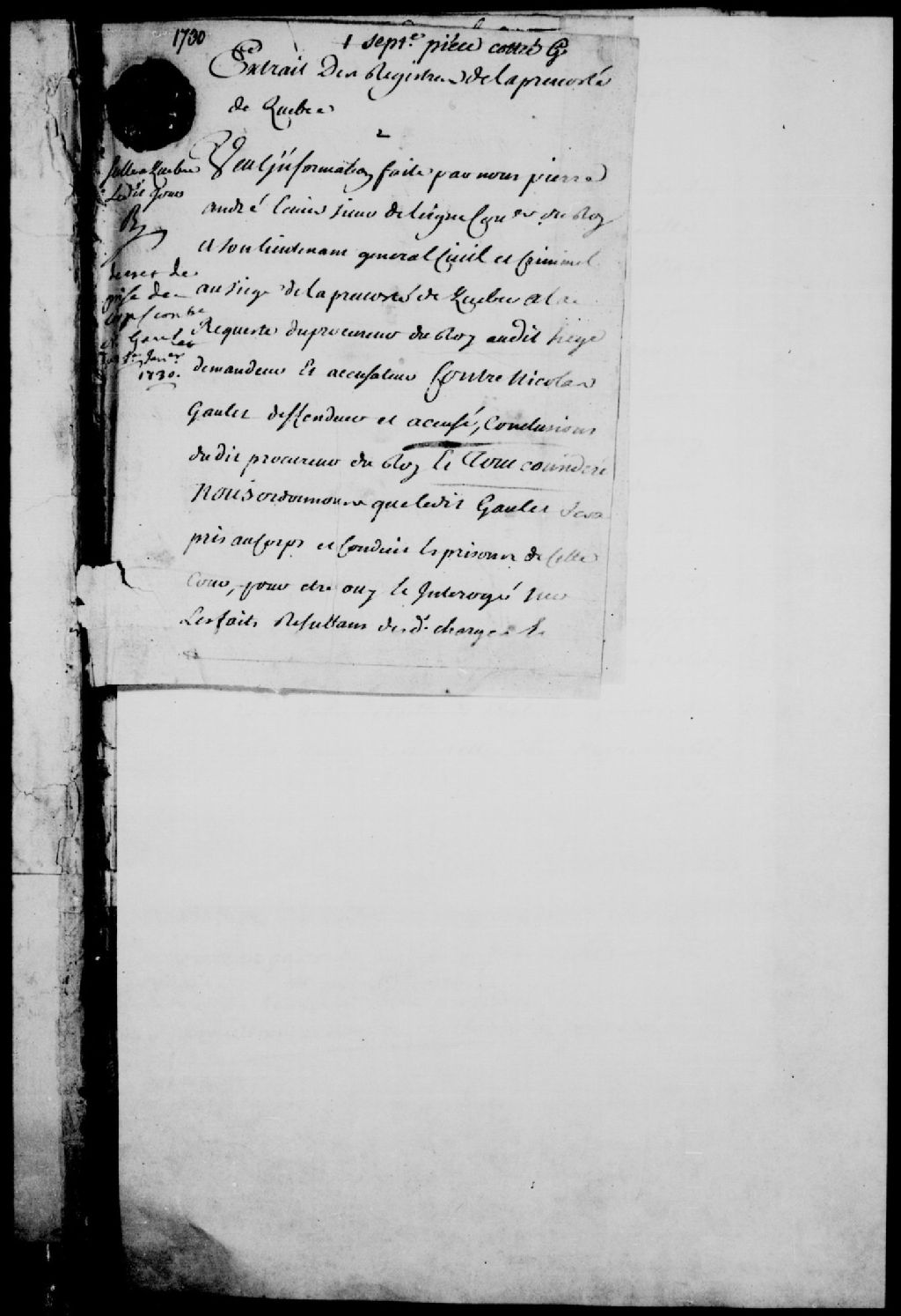- Procès de Nicolas Gaulet (Goulet) dit Rousselot, environ 28-29 ans, de Troyes, en Champagne, journalier de métier depuis qu'il est en Nouvelle-France, travaillant chez le nommé Gauvin, habitant de la seigneurie de la Rivière-Ouelle, demeurant à la petite rivière de la Baie-Saint-Paul, chez Jean de Lavoie, et de son complice Vincent Beauval, environ 24-25 ans, journalier à Québec, demeurant rue du Sault-au-Matelot, paroisse Notre-Dame, prisonniers, accusés de vol chez les Jésuites à Québec et dans la sacristie de l'église de Charlesbourg